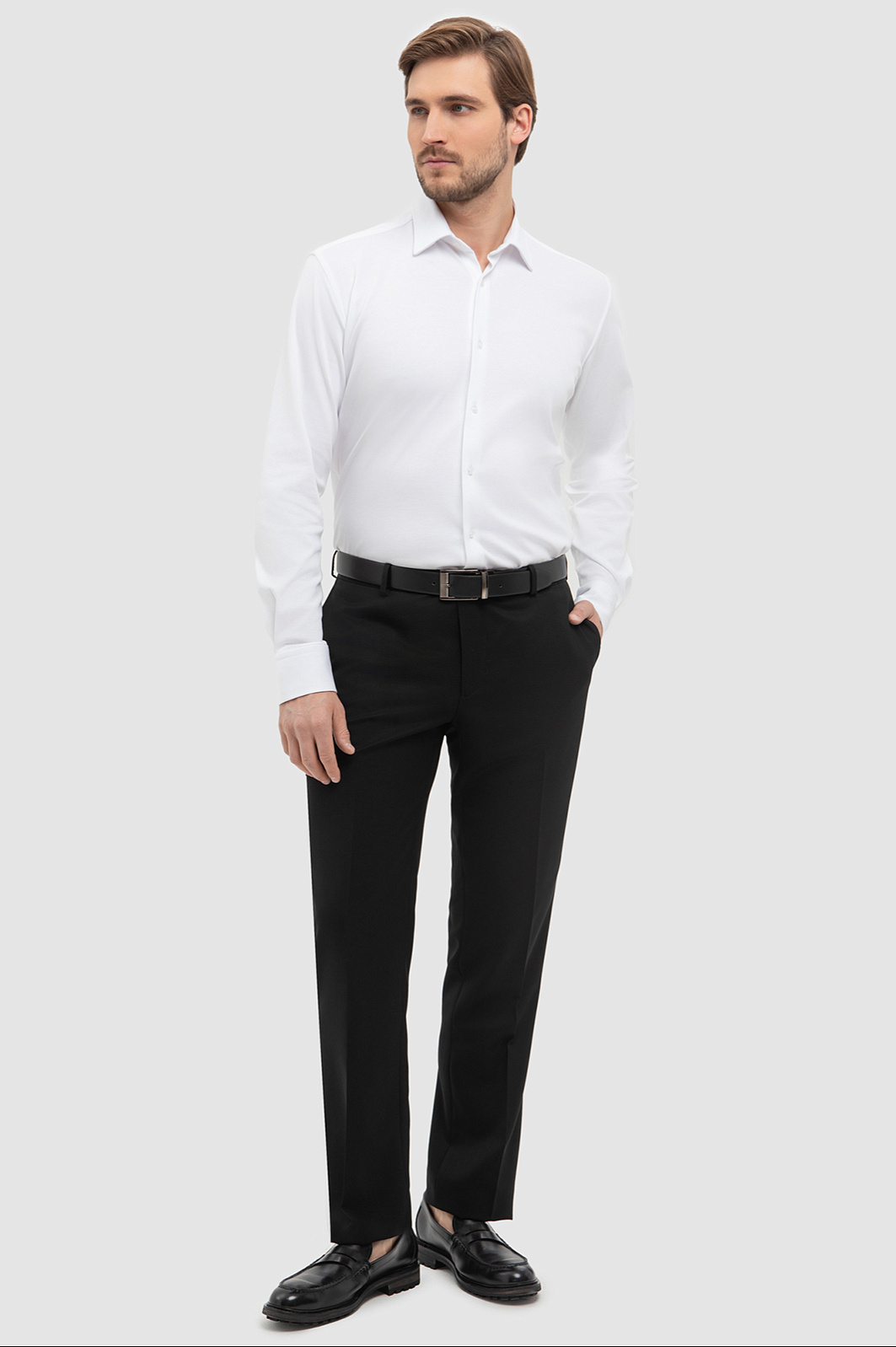 Черные брюки KANZLER со стрелками — выбор для функционального делового гардероба. Выполнены из высококачественной смесовой ткани (70% натуральная шерсть Супер 120S, 30% полиэстер). Нежная шерсть премиального качества обеспечивает комфорт и отличную воздухопроницаемость, а синтетические волокна добавляют износостойкость и помогают брюкам сохранять форму в течение дня и после стирок. Модель приталенного силуэта подчеркивает фигуру, а черный цвет придает изделию строгий вид. В деловой обстановке модель прекрасно смотрится с белой рубашкой и классическим пиджаком, завершая профессиональный образ. Для менее формальных встреч можно дополнить брюки легким джемпером или поло. Независимо от трендов, классические черные брюки остаются неизменным символом классического мужского стиля. Параметры модели: рост 187, 100-81-97 Размер на модели: 50