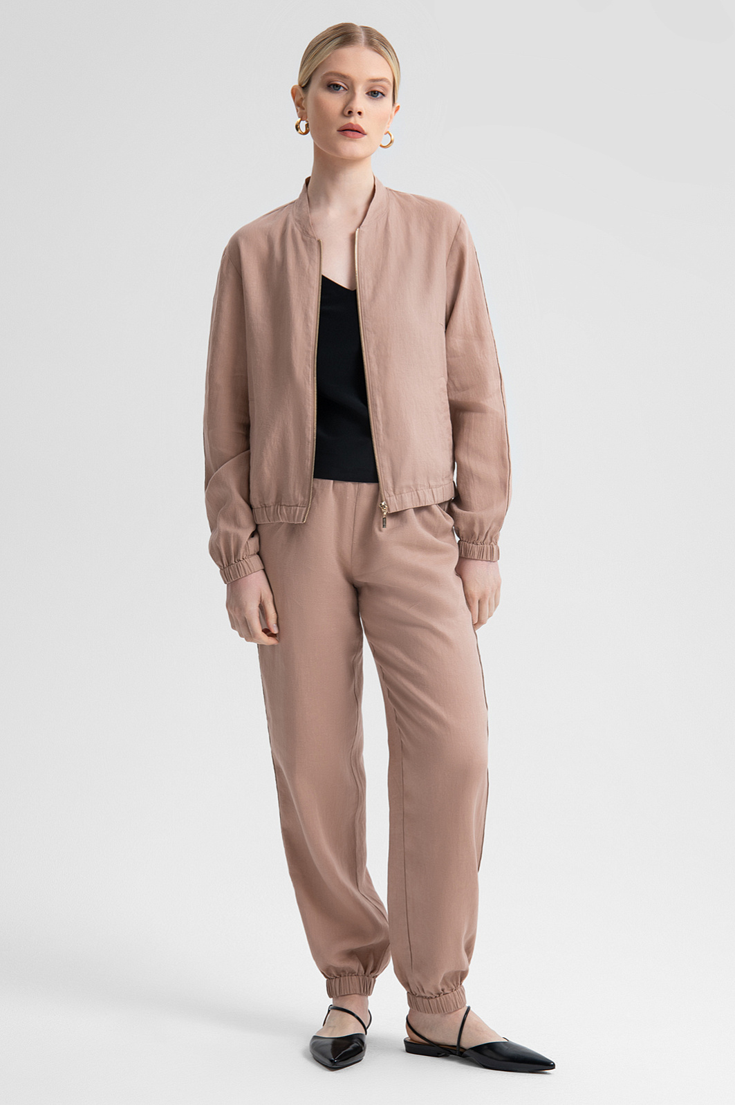 Стильные женские брюки из 100% льна пудрового цвета станут настоящей находкой для теплого сезона. Лен – ценный натуральный материал, известный своей прочностью, легкостью и терморегуляционными свойствами. Материал отлично пропускает воздух и отводит влагу, обеспечивая свежесть и комфорт даже в самый жаркий день. Пудровый цвет, нежный и универсальный, позволяет с легкостью сочетать брюки с различными элементами гардероба – от базовых футболок до женственных блузок и топов. Удобную посадку по фигуре обеспечивает резинка на талии, а эластичные манжеты на щиколотках создают расслабленный, но элегантный образ. Льняные брюки станут отличным выбором для прогулок, работы, отдыха и путешествий. Для создания стильного образа модель можно дополнить льняным бомбером из коллекции KANZLER . Параметры модели: рост 175, 88-65-92 Размер на модели: S