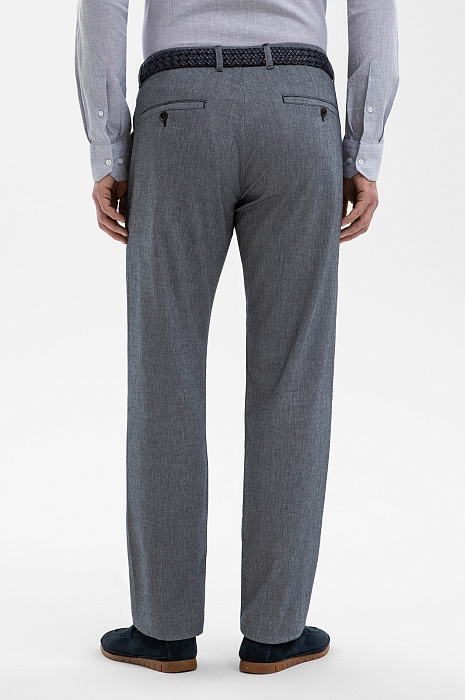 Комфортные брюки KANZLER из смесовой ткани спокойного синего оттенка с лёгким меланжевым эффектом — удачный повседневный вариант для офиса, путешествий и городских выходов. Прямой крой и мягкие защипы спереди обеспечивают аккуратный внешний вид и свободу движений. Плотная ткань создана на основе гипоаллергенного хлопка с добавлением льна, который придаёт материалу благородный, изысканный характер и приятную текстуру. Натуральные волокна усилены нитями полиэстера и вискозы, которые повышают износостойкость ткани. Добавка лайкры (2%) помогает адаптировать посадку к индивидуальным особенностям фигуры.