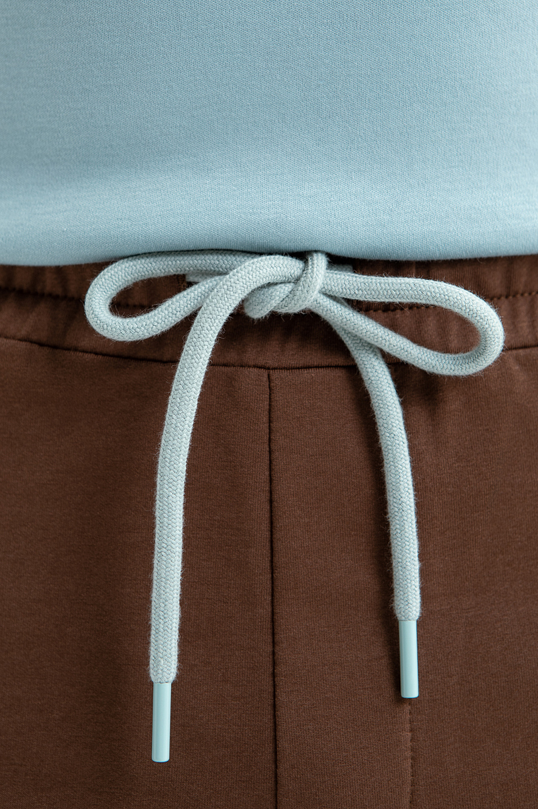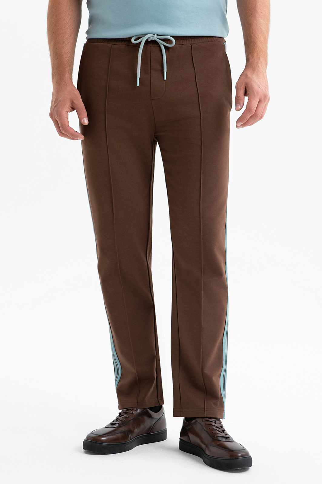 Джоггеры KANZLER на кулиске из хлопка в насыщенном коричневом цвете с голубым шнурком на поясе и лампасами — универсальная модель, которая пригодится для спортивных занятий и прогулок и может стать элементом расслабленного городского стиля. В качестве верха можно надеть коричневую толстовку KANZLER с голубыми акцентными деталями на молнии. Застроченные вертикальные стрелки придают брюкам аккуратности. Пояс на резинке удобно фиксируется шнурком. Материал брюк — мягкий и приятный к телу трикотаж на основе легкого дышащего гипоаллергенного хлопка. Параметры модели: рост 189, 102-80-99 Размер на модели: M