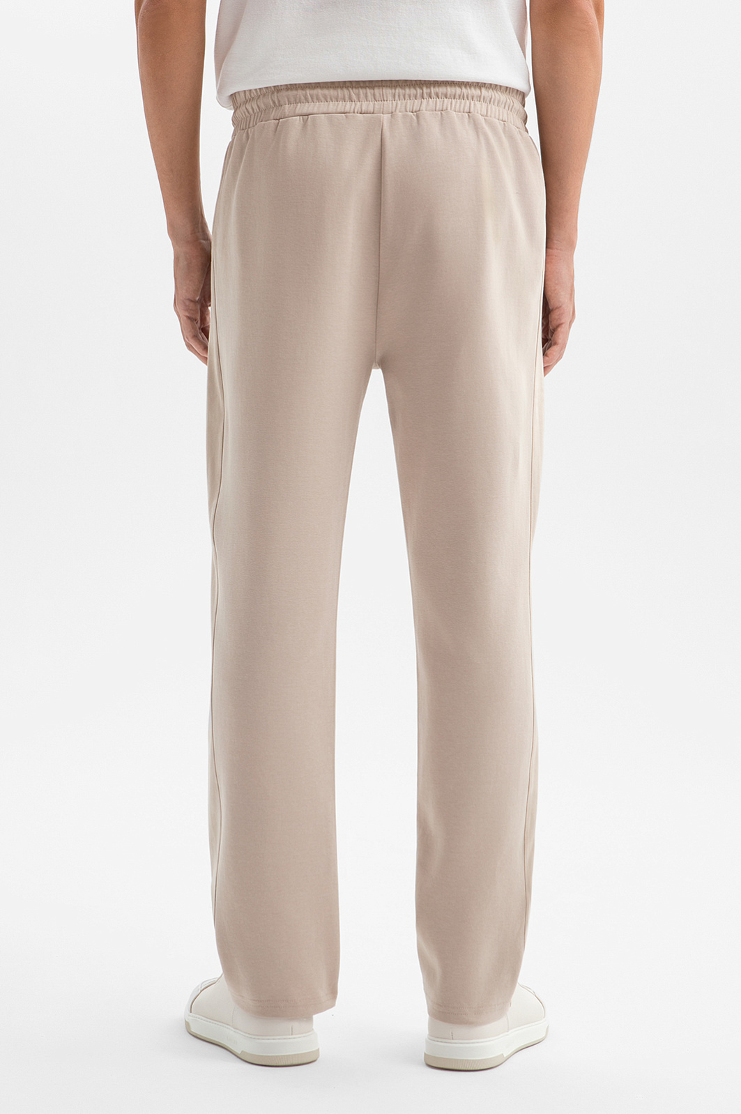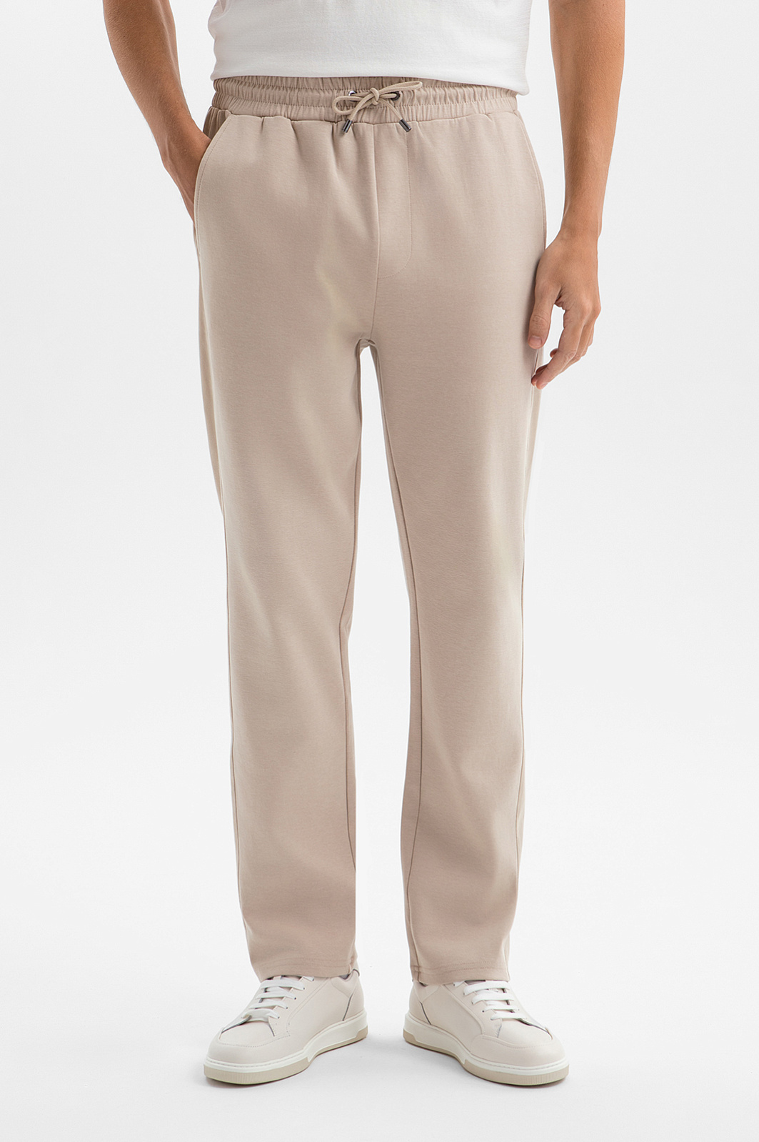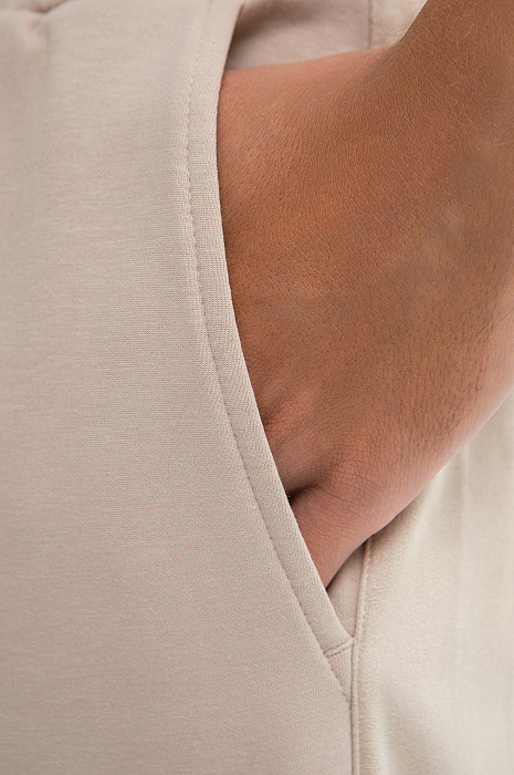 Светло-бежевые спортивные брюки из мягкого хлопкового трикотажа — идеальная одежда для любого вида активности: от неспешных прогулок до пробежек и лёгких тренировок. Однотонные лампасы подчёркивают спортивный характер модели, придавая образу динамику. Свободный крой не сковывает движений, а эластичный пояс на кулиске позволяет регулировать посадку по линии талии. Трикотаж выполнен из дышащего гипоаллергенного хлопка с добавлением полиэстера и спандекса. Такое сочетание обеспечивает отличные тактильные свойства, а также прочность и износоустойчивость ткани.