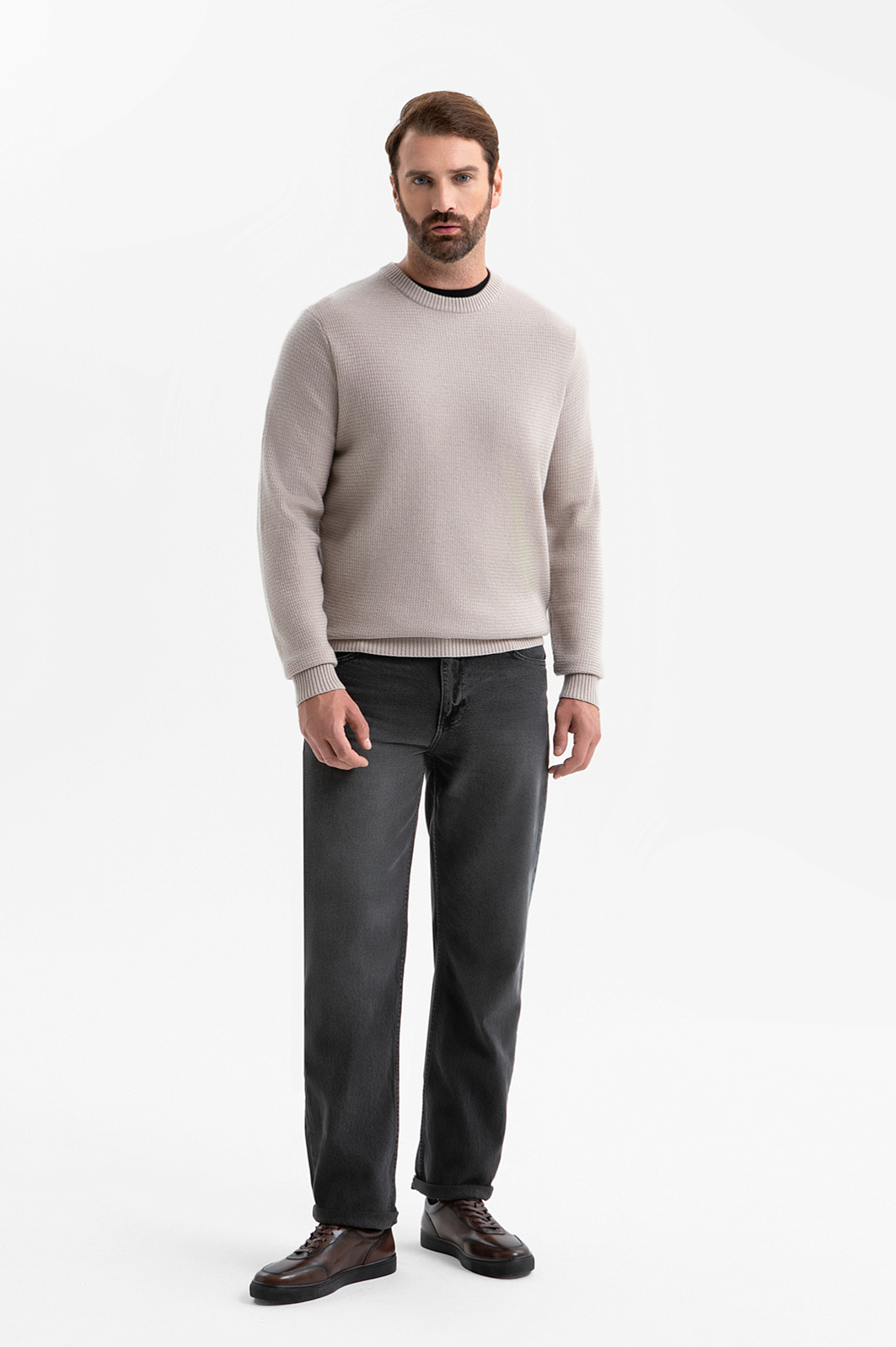 Светло-бежевый свитер KANZLER — воплощение непринуждённой элегантности и комфорта. Светлый оттенок в сочетании с лёгкой фактурой трикотажа делает образ изысканным и очень уютным. Классический круглый вырез горловины мягко обрамляет шею, создавая аккуратный и гармоничный силуэт, а плотные трикотажные резинки на манжетах и по низу обеспечивают идеальную посадку и сохраняют форму в движении. Мягкий трикотаж создан из высококачественной шерсти и нежнейшего кашемира. Такое сочетание обеспечивает приятную температуру для тела и тактильное удовольствие при каждом прикосновении. Параметры модели: рост 189, 102-80-99 Размер на модели: M