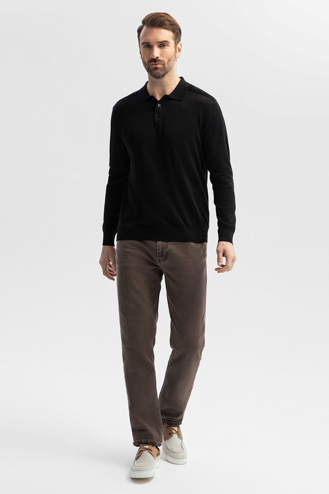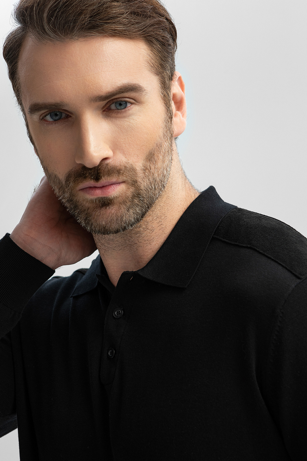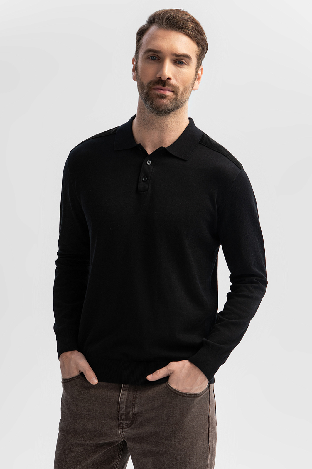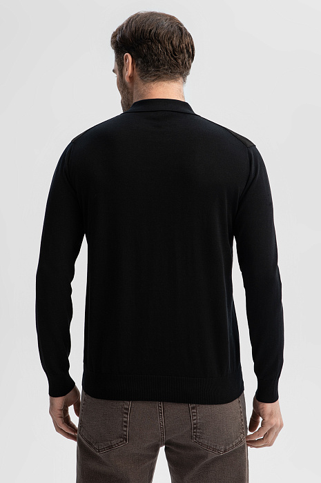 Роскошное черное поло KANZLER с пуговицами и длинным рукавом из хлопка, шелка и льна придает официальному образу стильность и привносит в повседневные аутфиты изысканность и респектабельность. Модель подходит для встреч, деловых поездок и приятного вечернего отдыха в городе. Мягкие широкие резинки на рукавах и снизу обеспечивают безупречную посадку. Практически неосязаемая легкая вещь создана из гладкого трикотажного полотна исключительного качества. В составе премиальной ткани —воздушный дышащий хлопок, легчайший благородный шелк и прочный износоустойчивый лен. На плечах модель декорирована бархатистой алькантарой. Параметры модели: рост 189, 102-80-99 Размер на модели: M