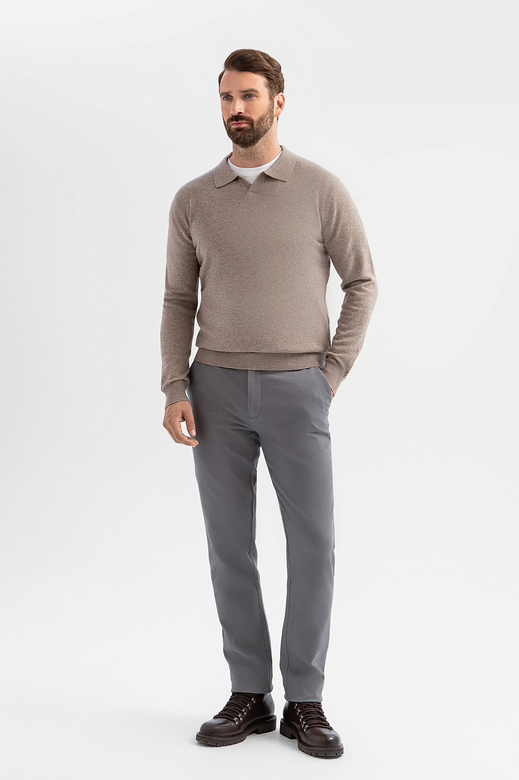 Джемпер поло KANZLER создан для ценителей вневременного стиля. Классический крой с треугольным вырезом создает элегантный силуэт, подходящий для деловой среды и повседневной носки. Роскошный материал объединил лучшие свойства натуральных волокон: шерсть обеспечивает терморегуляцию, а кашемир добавляет мягкость, улучшает тактильные ощущения и сохраняет тепло. Сложный серо-бежевый оттенок подчеркивает статусность и сочетается со множеством элементов гардероба – от строгих костюмов до расслабленных джинсов. Параметры модели: рост 189, 102-80-99 Размер на модели: M