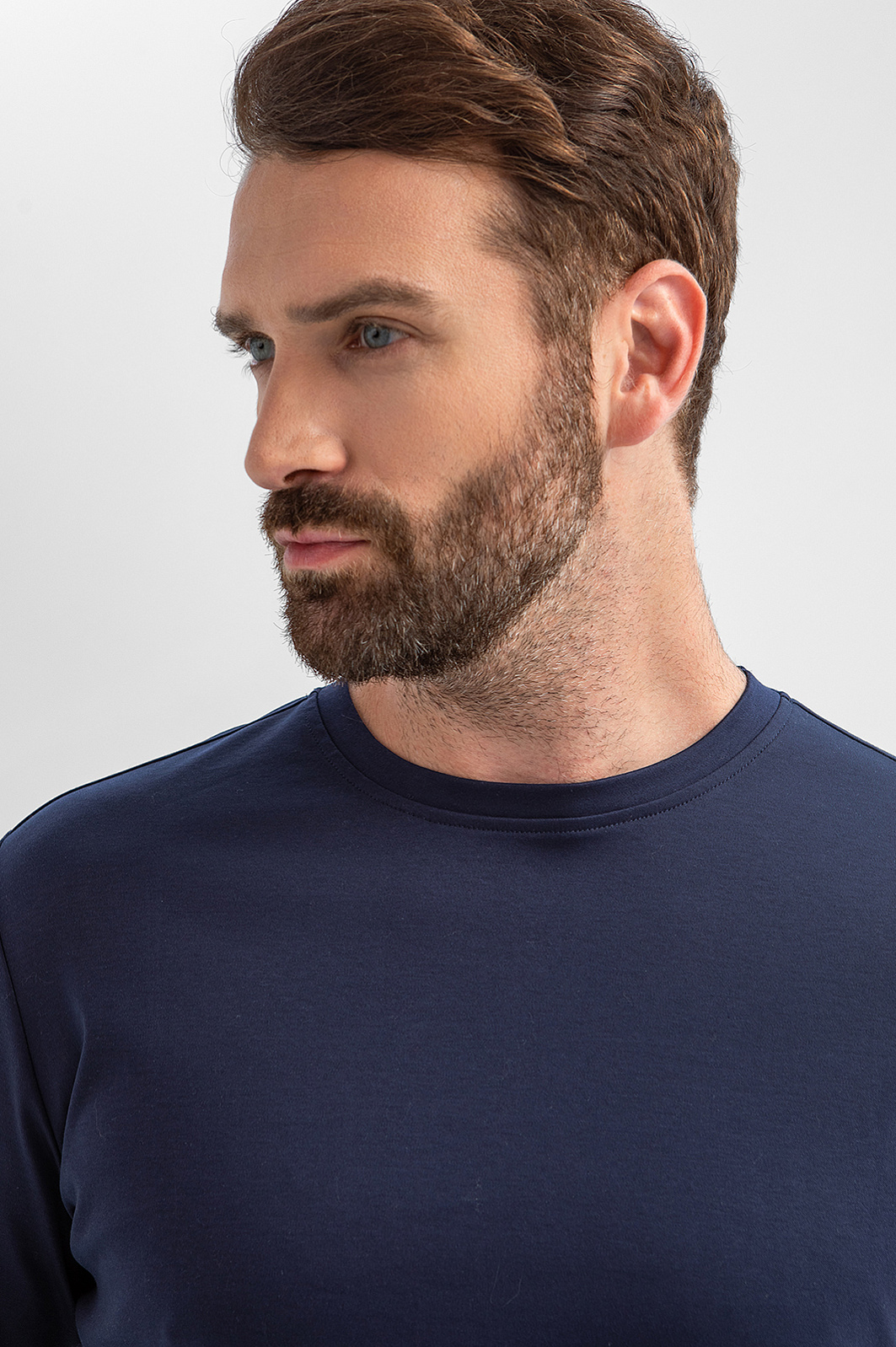 Темно-синий лонгслив KANZLER – универсальная база гардероба в превосходном исполнении. Модель выполнили из 100-процентного хлопка премиального качества. Материал обеспечивает идеальный воздухообмен и отводит влагу. Мерсеризованный хлопок плотного плетения с приятной фактурой сохраняет форму и цвет после многократных стирок. Темно-синий оттенок – выбор для множества образов, от кежуал до спортивных. Носите лонгслив как самостоятельный элемент или создавайте многослойные образы с кардиганом или рубашкой. Параметры модели: рост 189, 102-80-99 Размер на модели: M