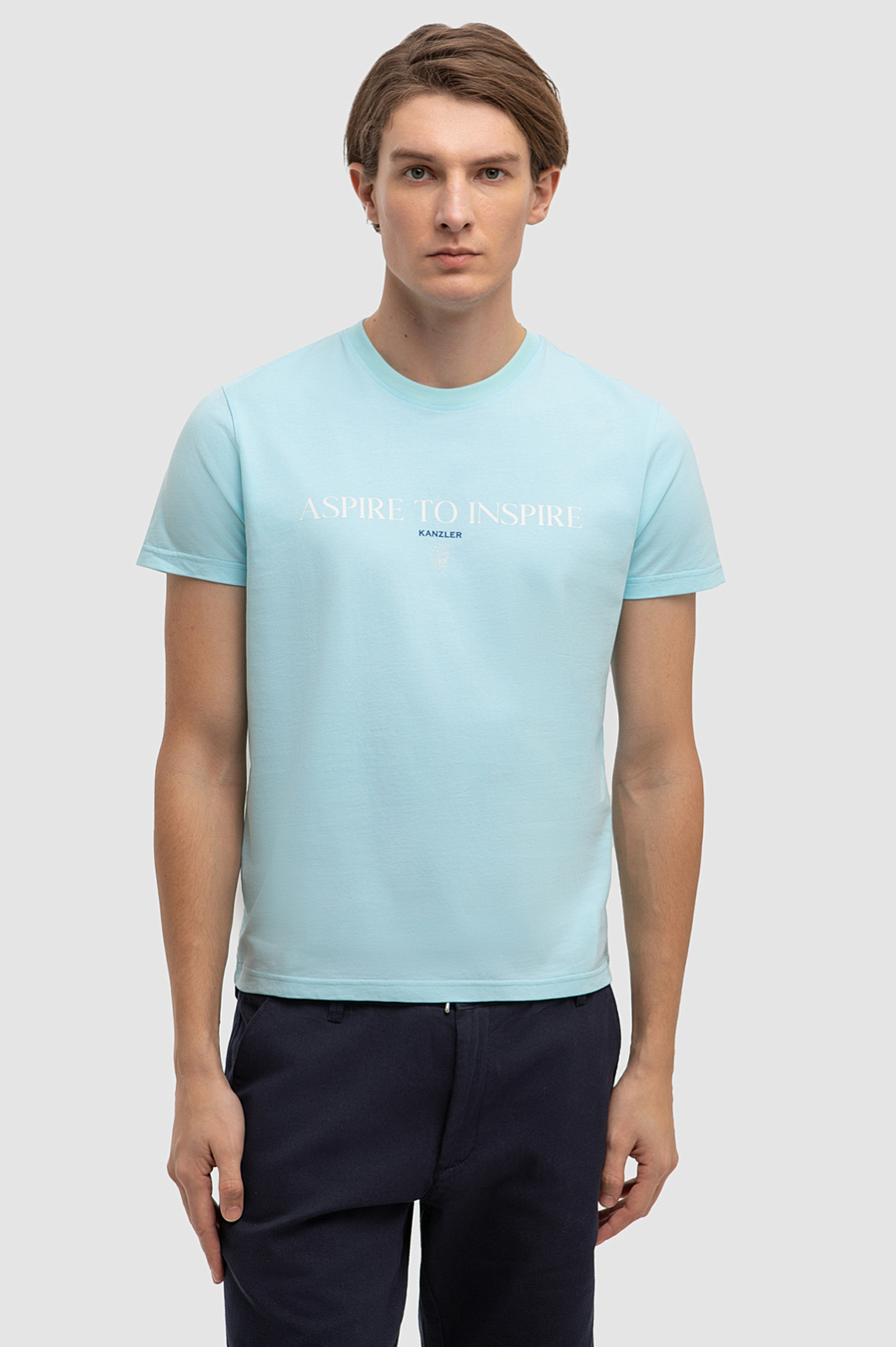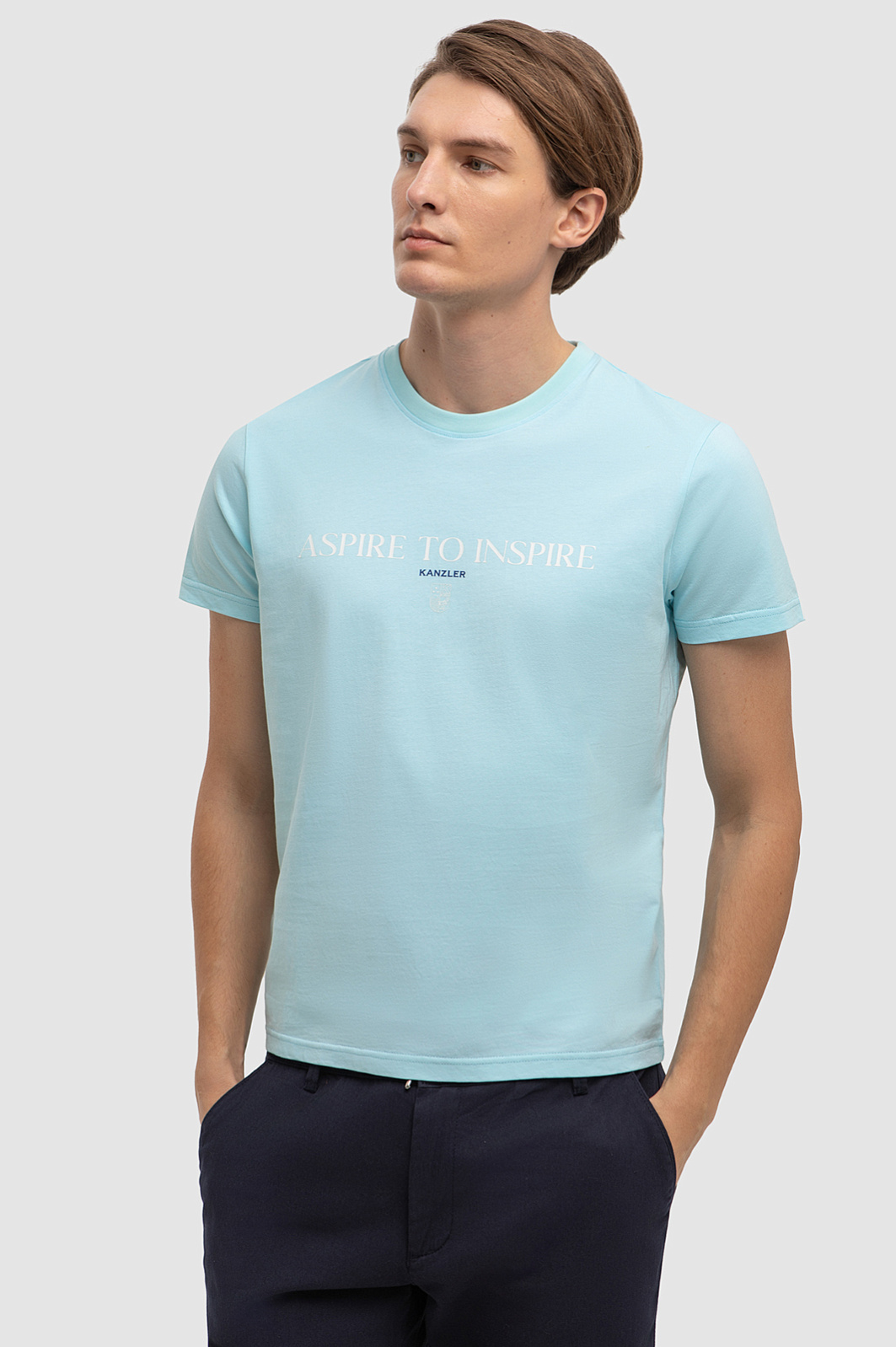 Футболка KANZLER красивого светло-бирюзового оттенка из чистого хлопка украшена слоганом и небольшим фирменным логотипом. Она идеально подойдет для активного отдыха — прогулок по городу, уик-энда на природе и пляжных вечеринок. Прилегающий крой подчеркивает достоинства спортивной фигуры и не сковывает движений. 100-процентный хлопок высокого качества бережет тело от солнца и прохлады. Гипоаллергенные дышащие волокна создают циркуляцию воздуха, оптимальный микроклимат и отводят влагу. Параметры модели: рост 191, 97-77-99 Размер на модели: M