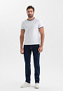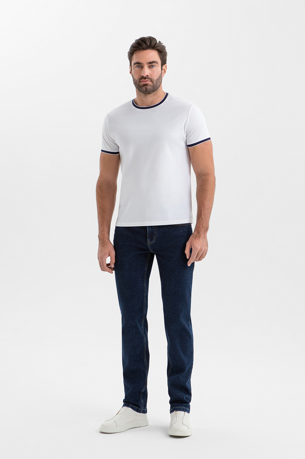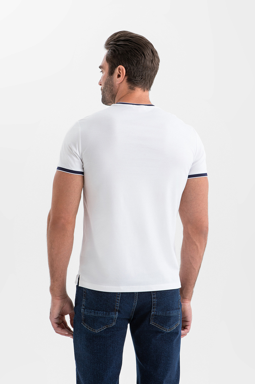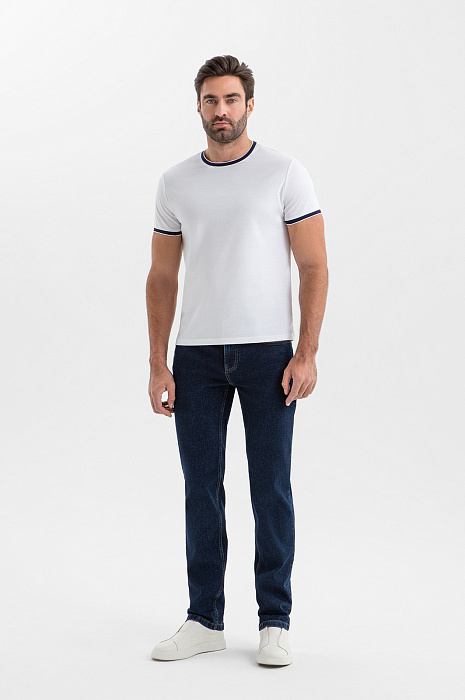 Белая футболка KANZLER с круглым вырезом из мерсеризованного хлопка — выверенная база с графичными деталями. Она легко вписывается в гардероб мужчины, который выбирает качество, лаконичность и минимализм. Прилегающий крой мягко подчёркивает силуэт, формируя собранный и уверенный образ. Контрастные синие полоски по краям горловины и рукавов расставляют точные акценты и придают образу нотку ретро-шика. Плотный высококачественный трикотаж из 100% мерсеризованного хлопка отличается лоском, гладкой текстурой и высокой износостойкостью. Его воздухопроницаемые гигроскопичные волокна поддерживают оптимальный микроклимат и свежесть весь день.