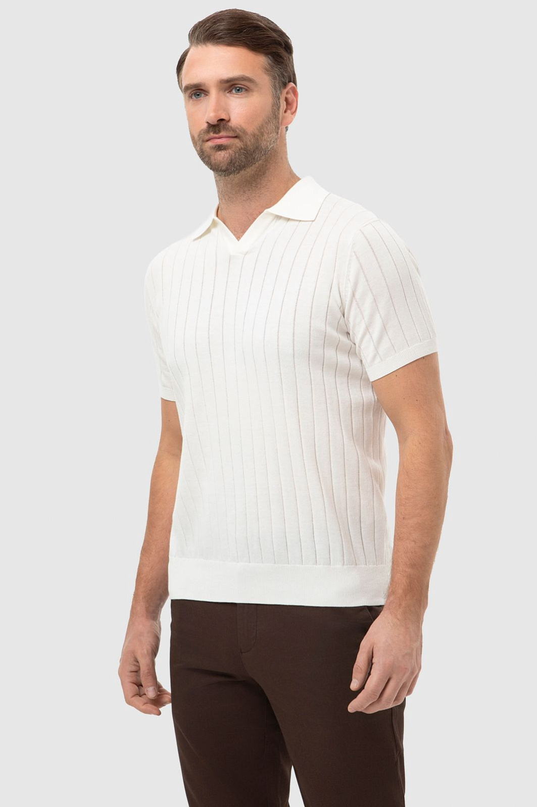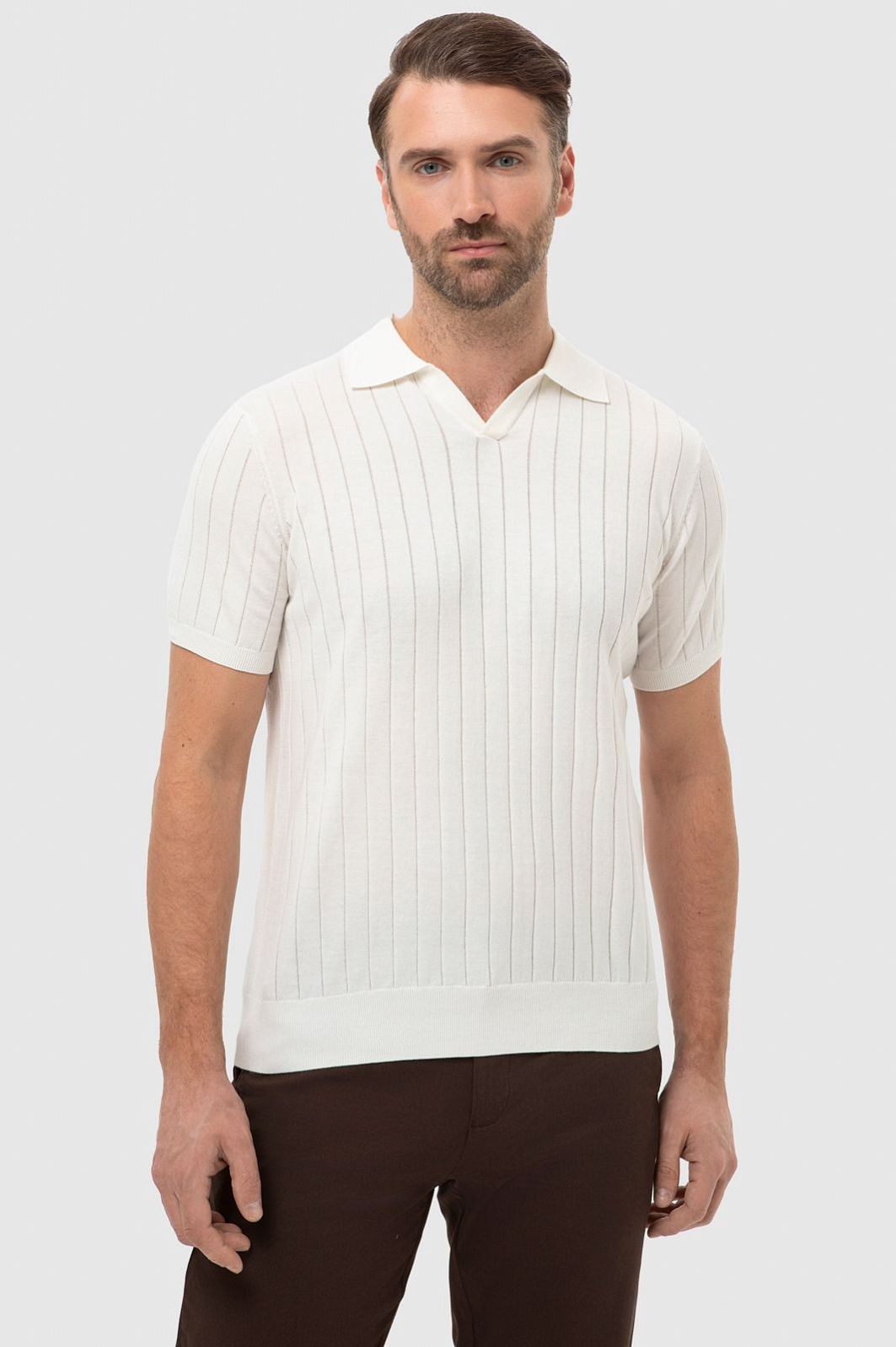 Поло KANZLER молочного оттенка с небольшим треугольным вырезом адресовано любителям спокойных уик-эндов, приятного отдыха и путешествий. Модель гармонично сочетается с одеждой естественных оттенков в стиле кежуал и спорт. Крой — прямой. Тонкие вертикальные перфорированные линии визуально вытягивают фигуру и придают образу легкость. Мягкий трикотаж безупречного качества из премиального 100-процентного хлопка Пима выглядит роскошно. Натуральные волокна пропускают воздух и отводят лишнюю влагу, поддерживая ощущение комфорта целый день. Параметры модели: рост 189, 102-80-99 Размер на модели: M