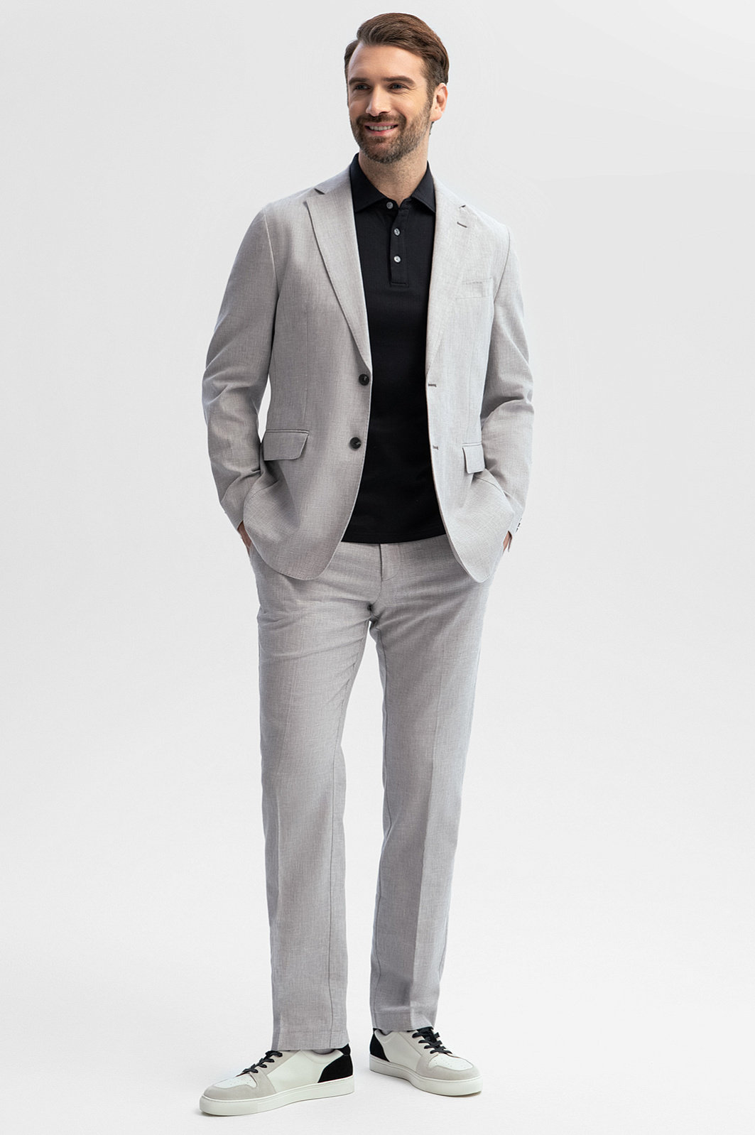 Стильный светло-серый костюм KANZLER из хлопка и льна для теплого сезона составлен из мягкого облегченного пиджака без подкладки и свободных брюк без защипов. Классический крой с традиционными деталями — портновской строчкой на лацканах, карманами с клапаном и стрелки на брюках придают повседневному образу непринужденность и элегантность. Комфорт обеспечивает свободный силуэт и мягкая структура ткани. Материал полотняного переплетения, созданный из легкого воздушного хлопка и прочного износоустойчивого льна, — фаворит летнего сезона. Он сохраняет оптимальную для тела температуру и обеспечивает ощущение прохлады в жаркие дни.