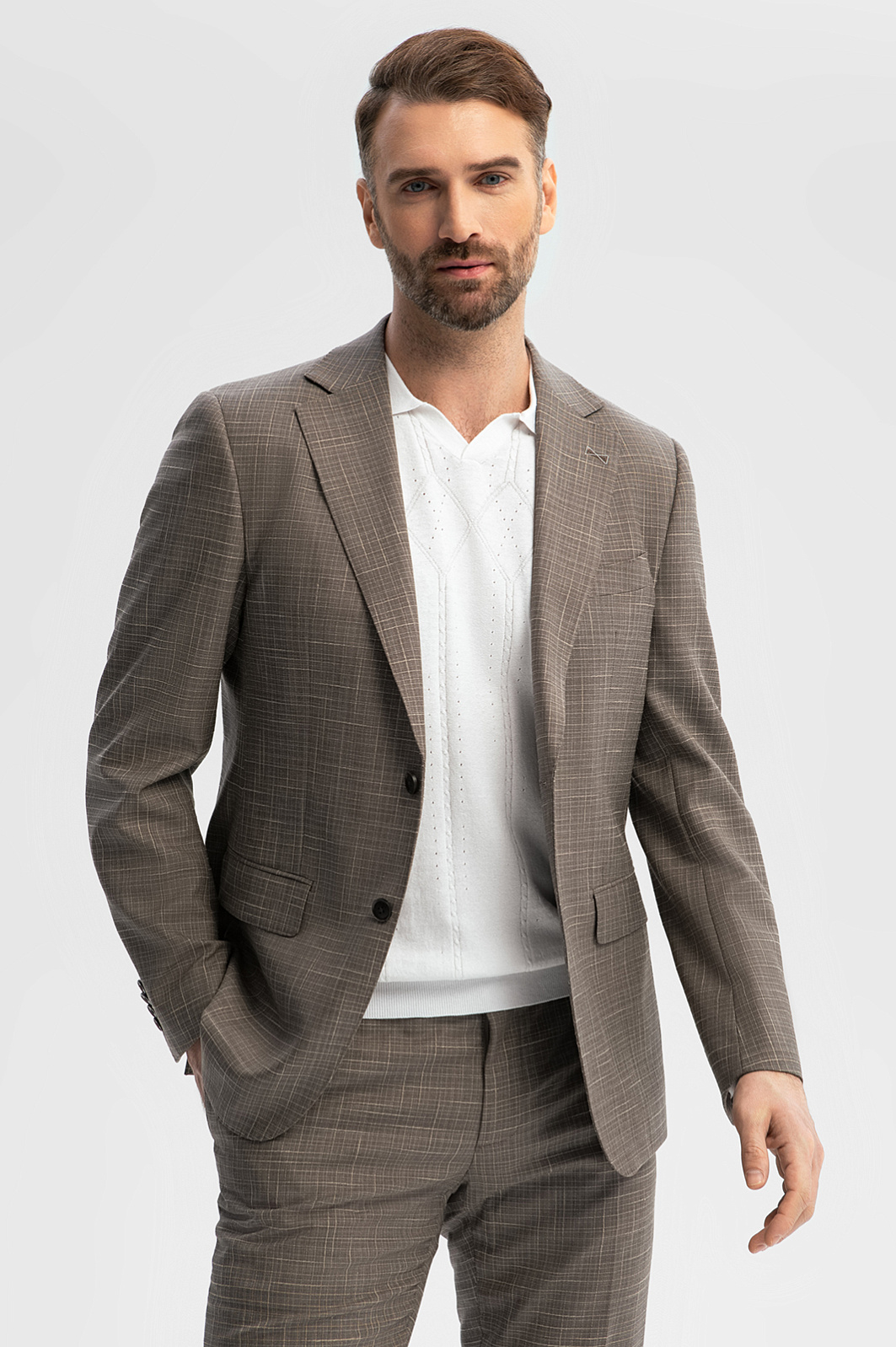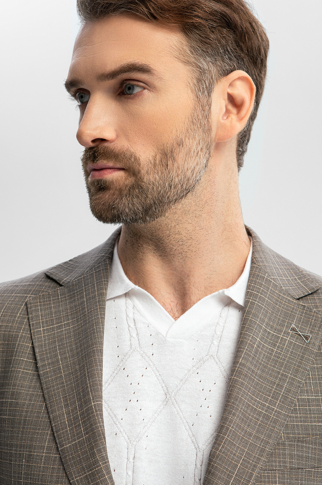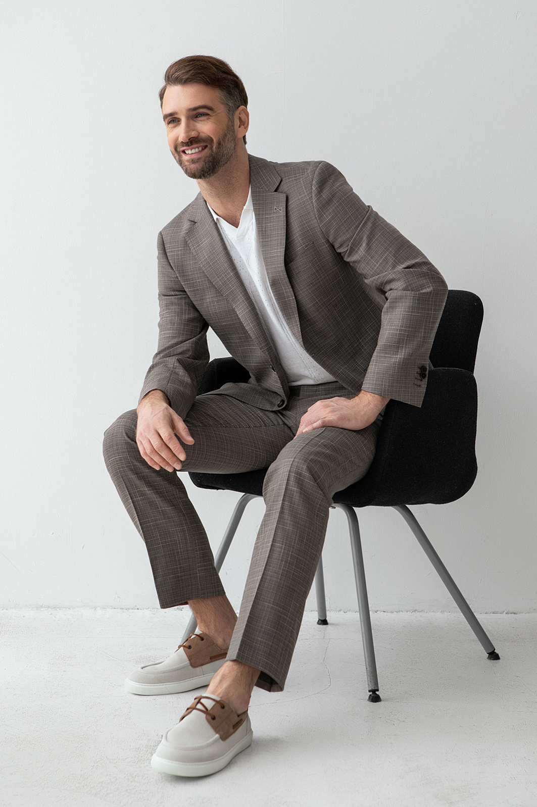 Светло-коричневый костюм KANZLER из шерсти, хлопка и льна с водоотталкивающей обработкой — союз современной элегантности, аристократической небрежности и комфорта. Двойка составлена из классического однобортного пиджака приталенного силуэта с естественной линией плеча и двумя шлицами сзади и слегка зауженных брюк со стрелками. Рисунок в тонкую клетку добавляет образу легкости. Натуральная смесовая ткань — воплощение роскоши и комфорта. Упругие волокна тонкой шерсти мериноса Cупер 120S (90%) хорошо держат форму и придают материалу благородный лоск. Хлопок и лен обеспечивают теплорегуляцию и свежесть тела. Особая обработка защищает ткань от капризов погоды и загрязнений.