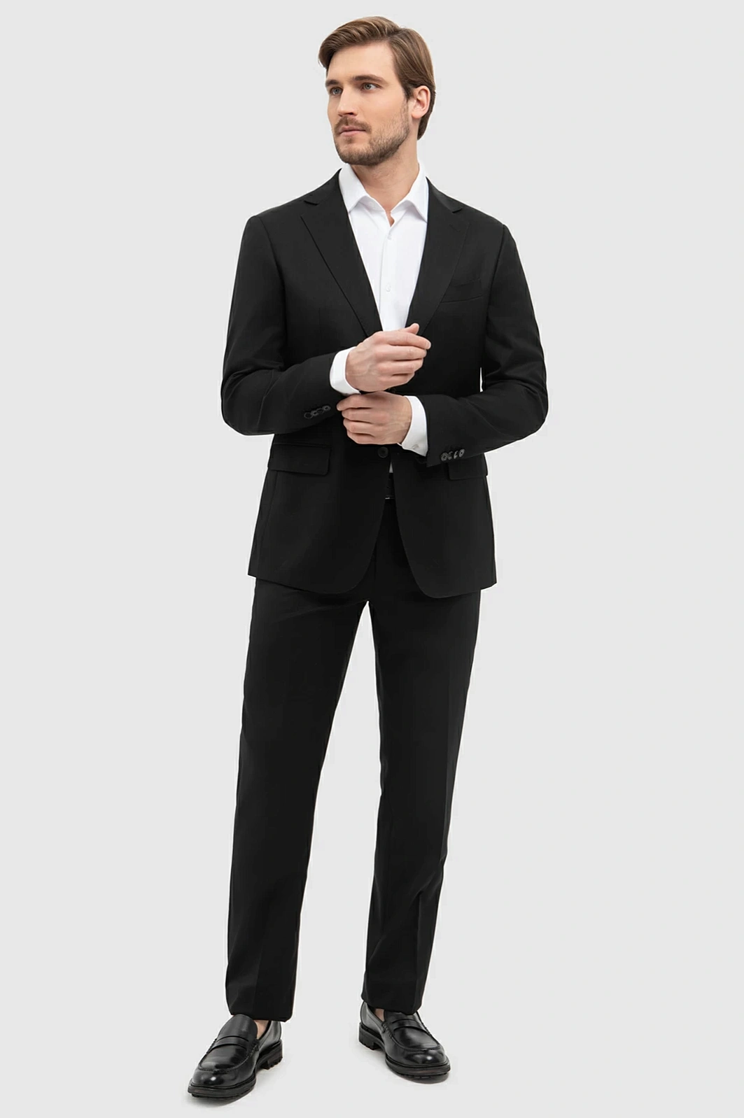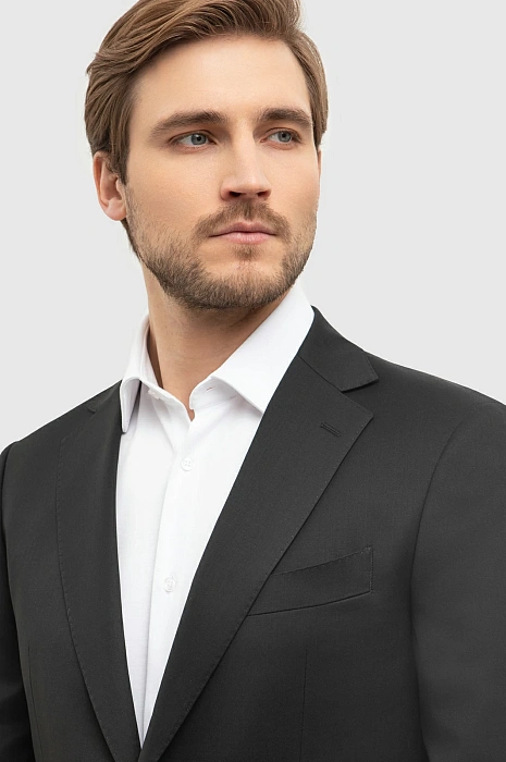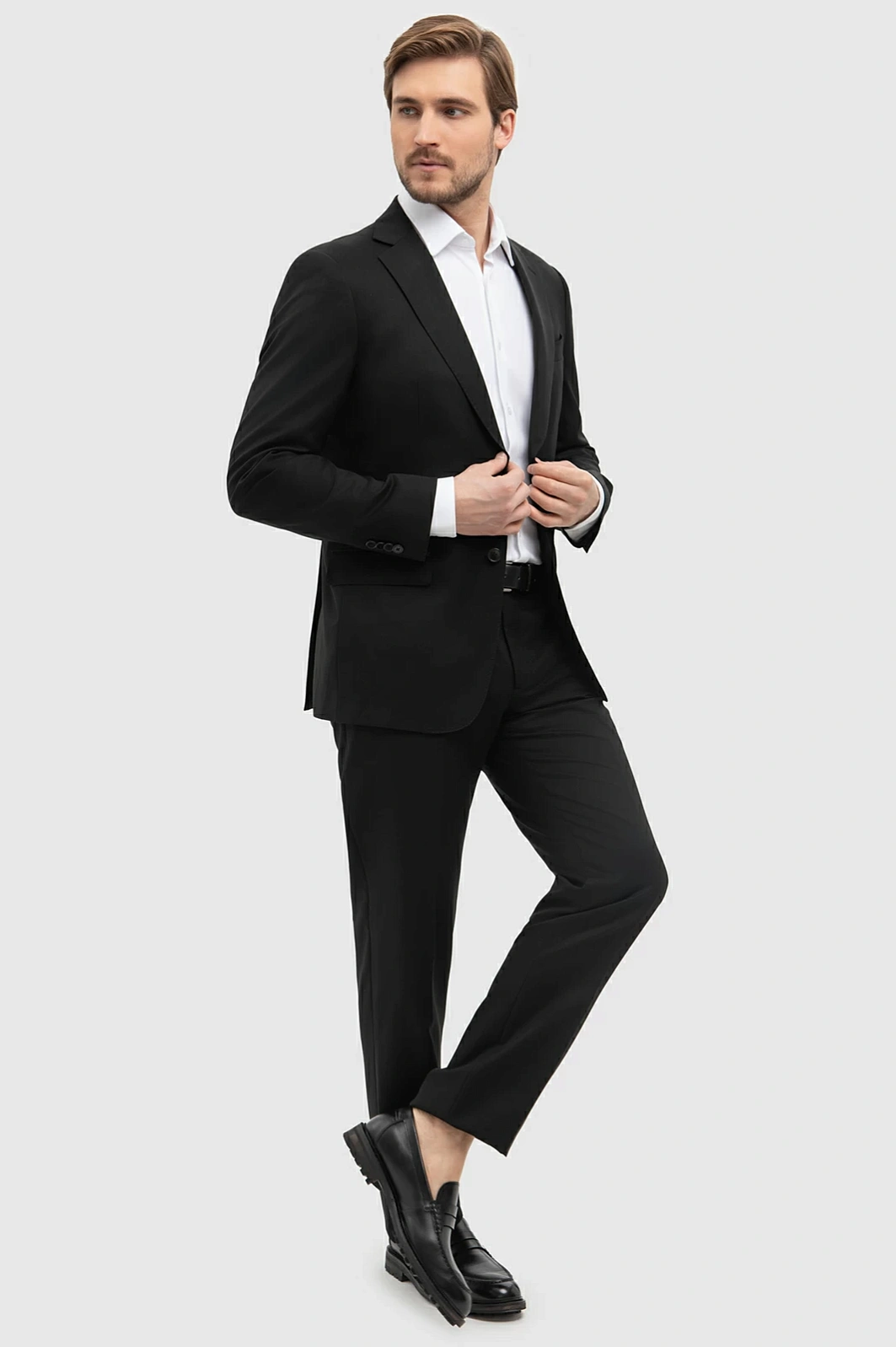 Черный однотонный костюм воплощает элегантность и идеально подходит для деловой встречи и торжественного вечернего мероприятия. Сочетание выверенного кроя и натуральной ткани, усиленной прочным синтетическим волокном, делает пиджак с узкими лацканами и брюки со стрелками максимально комфортными. Высококачественный материал на основе премиальной шерсти мериноса Супер 120S тактильно приятен и долговечен, а подкладка из вискозы добавляет еще больше комфорта в носке. Пиджак великолепно садится по фигуре, сохраняя четкость линий кроя и придавая уверенности в любой ситуации. Приталенный силуэт очерчивает фигуру, а английский воротник и гладкая фактура ткани с матовым финишем придают костюму аристократическую изысканность. Прямые брюки со стрелками завершат образ, подчеркивая вашу безупречность в каждом движении. Пиджак застегивается на пуговицы. Этот костюм станет вашим верным спутником, подчеркивая безупречный вкус и уверенность в себе, независимо от повода.