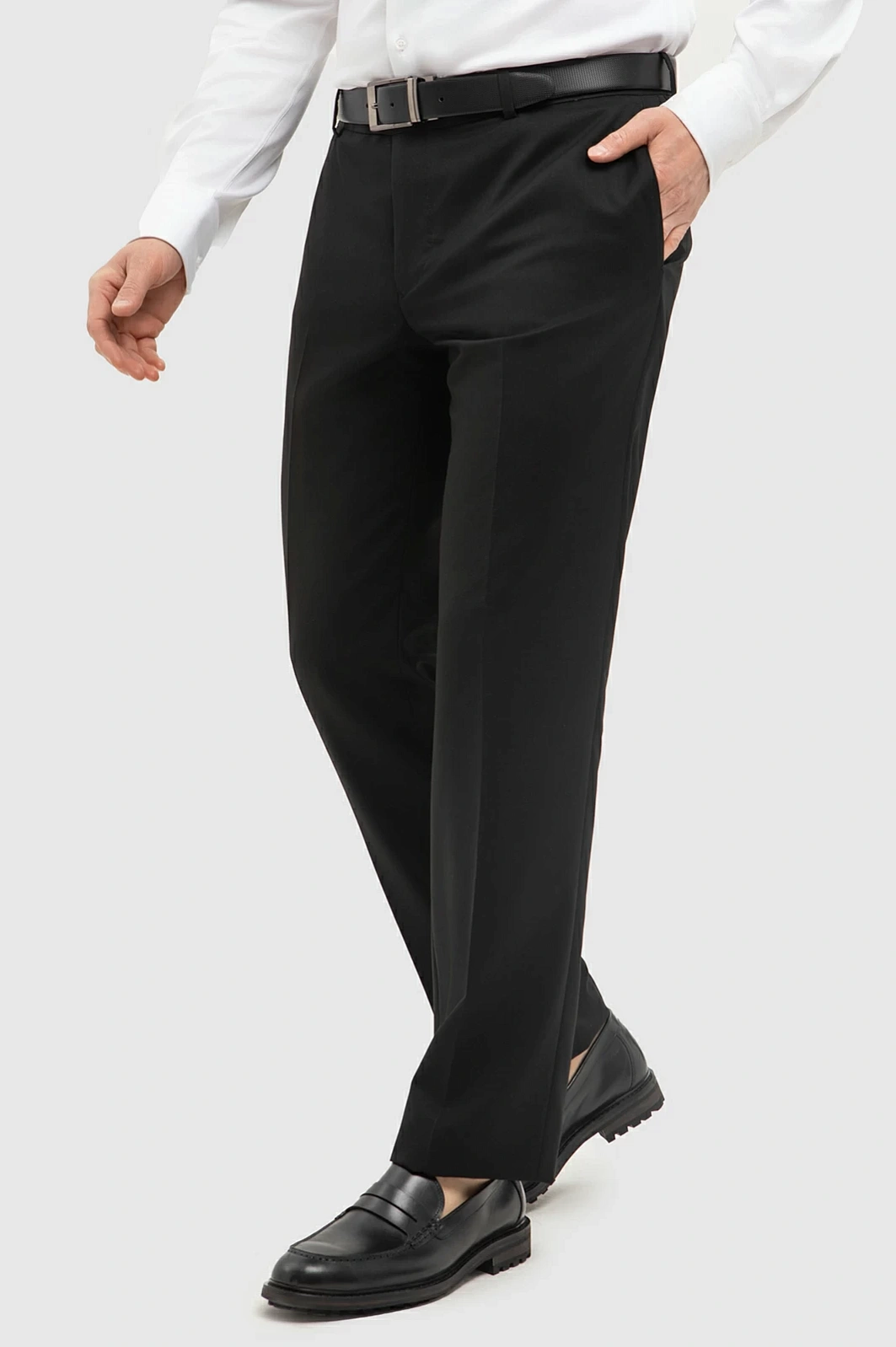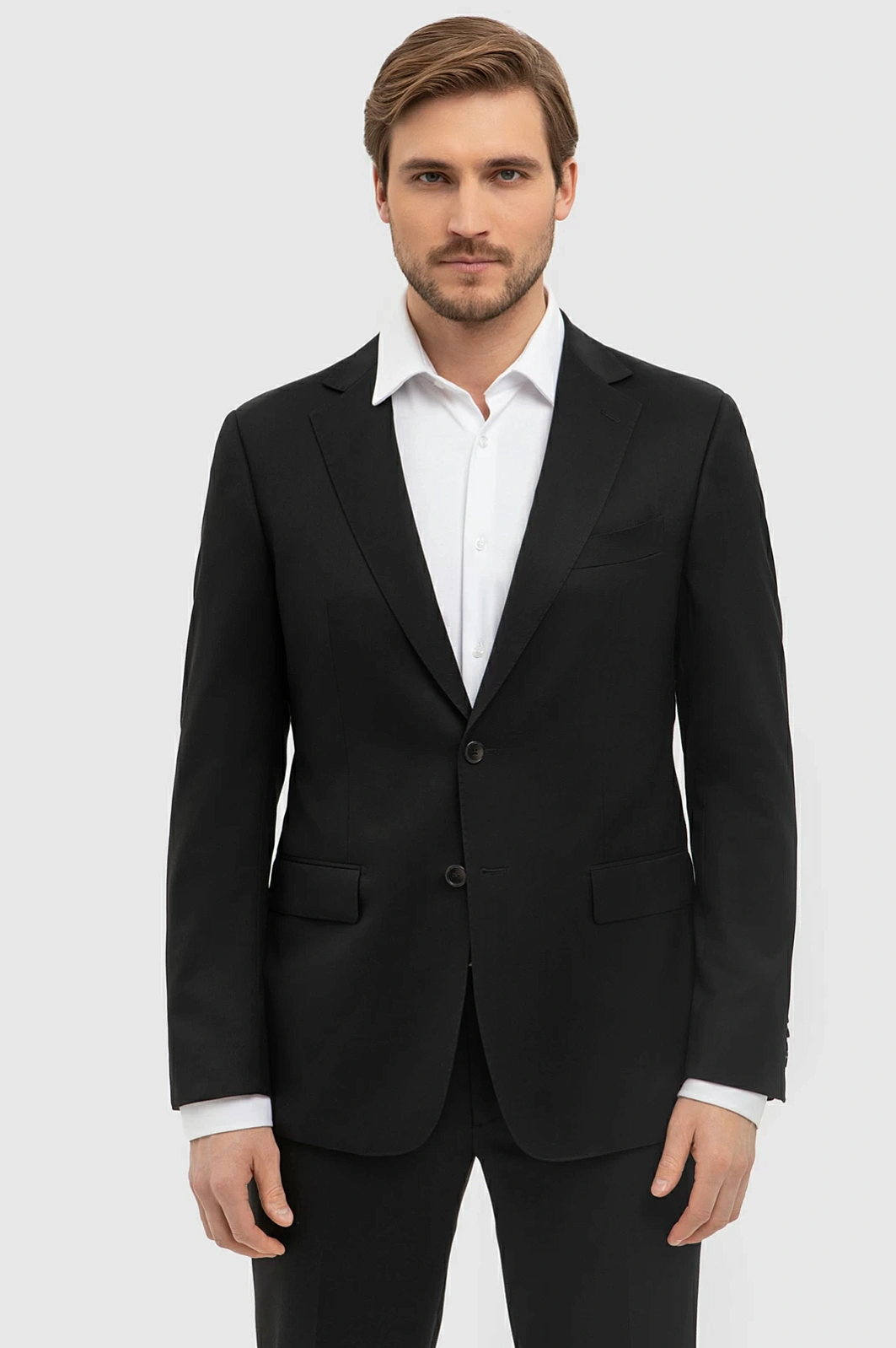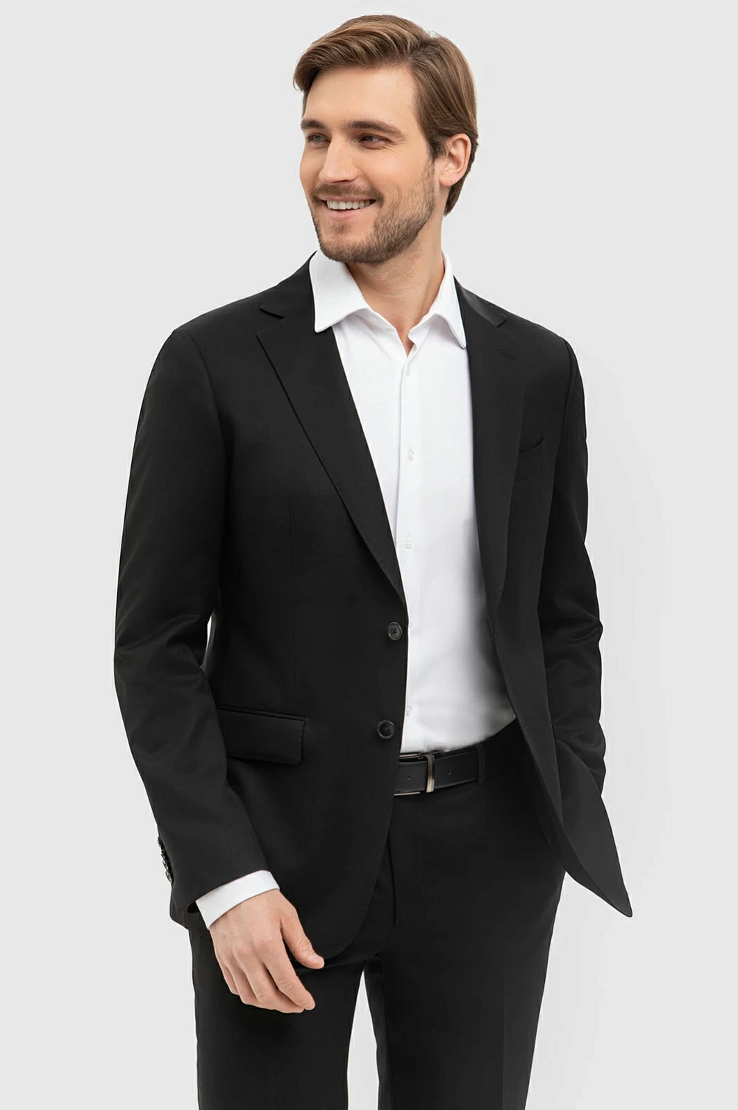 Черный однотонный костюм воплощает элегантность и идеально подходит для деловой встречи и торжественного вечернего мероприятия. Сочетание выверенного кроя и натуральной ткани, усиленной прочным синтетическим волокном, делает пиджак с узкими лацканами и брюки со стрелками максимально комфортными. Высококачественный материал на основе премиальной шерсти мериноса Супер 120S тактильно приятен и долговечен, а подкладка из вискозы добавляет еще больше комфорта в носке. Пиджак великолепно садится по фигуре, сохраняя четкость линий кроя и придавая уверенности в любой ситуации. Приталенный силуэт очерчивает фигуру, а английский воротник и гладкая фактура ткани с матовым финишем придают костюму аристократическую изысканность. Прямые брюки со стрелками завершат образ, подчеркивая вашу безупречность в каждом движении. Пиджак застегивается на пуговицы. Этот костюм станет вашим верным спутником, подчеркивая безупречный вкус и уверенность в себе, независимо от повода.