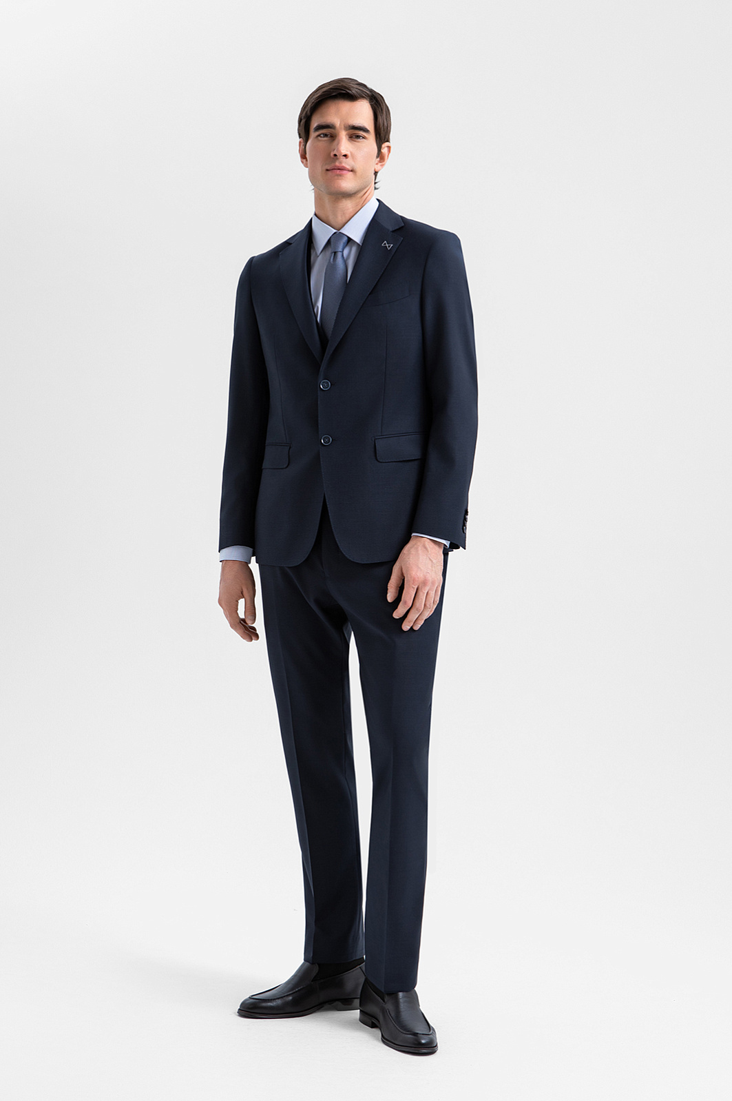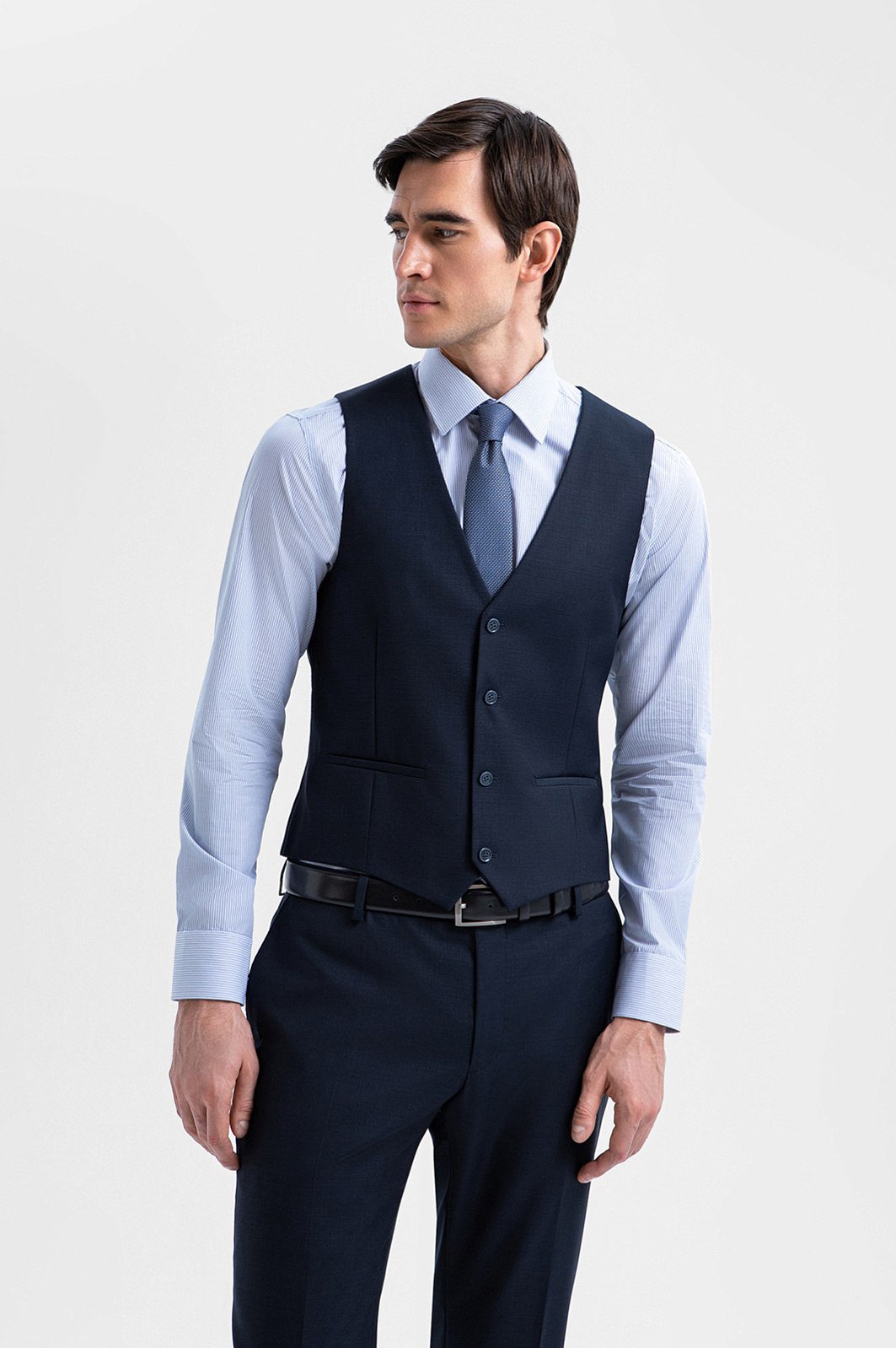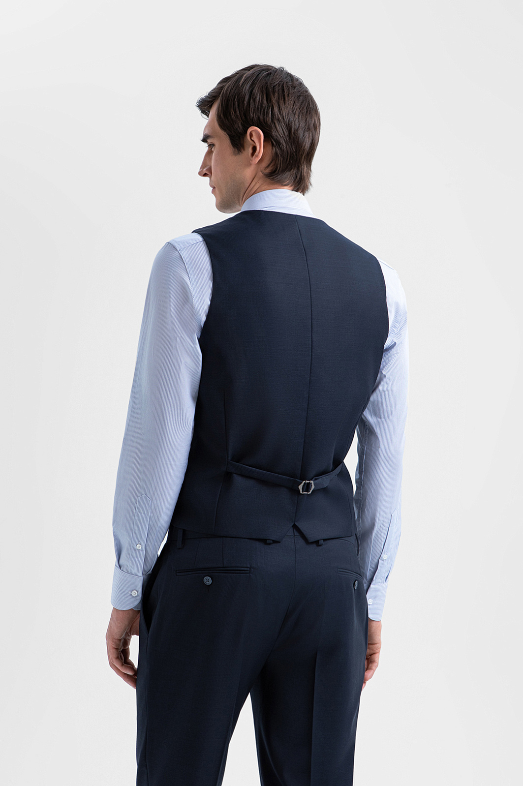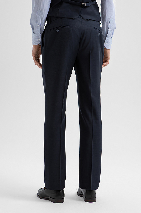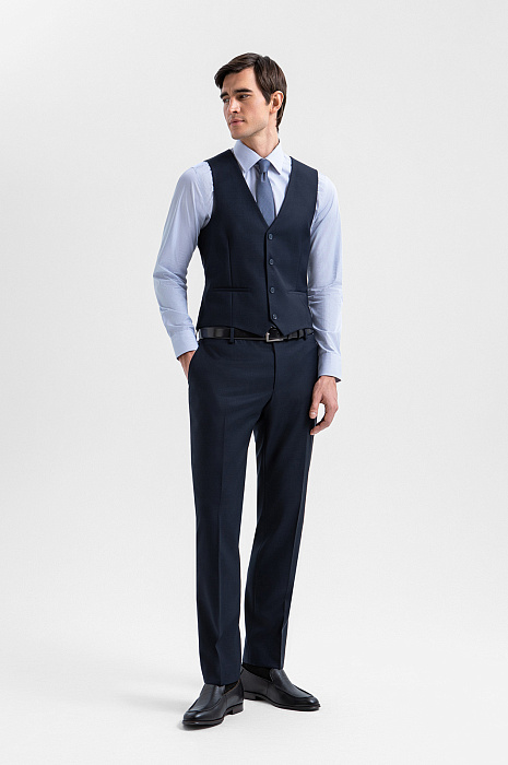 Роскошный синий костюм-тройка KANZLER из шерсти мериноса Супер 120S создан для уверенного движения к цели, какой бы грандиозной она бы ни была. А в неформальной обстановке его можно носить без пиджака. Посадка всех элементов — однобортного пиджака, изящного жилета и брюк со стрелками — безупречна и вместе, и по отдельности. Секрет изящной многослойности заключается в портновском мастерстве и слегка зауженном крое. Тонкая костюмная ткань из мериноса мягко облегает тело, создавая ощущение деликатной заботы и нежности. Упругие шелковистые волокна шерсти хорошо держат форму, берегут естественное тепло тела и придают материалу благородный лоск.