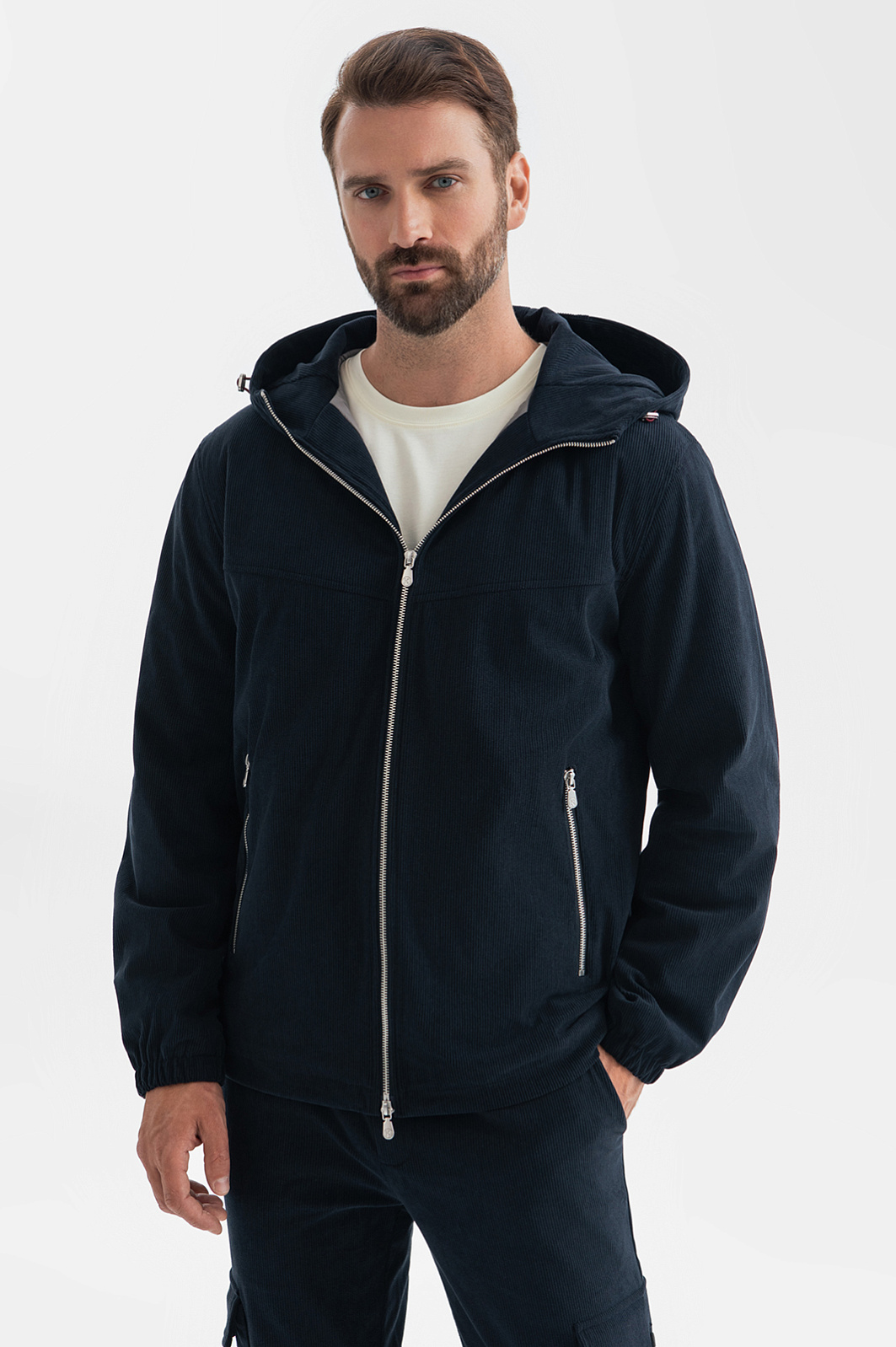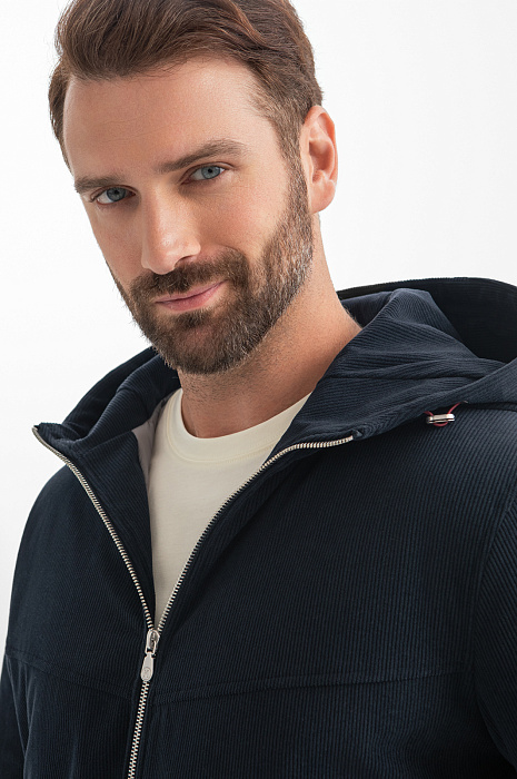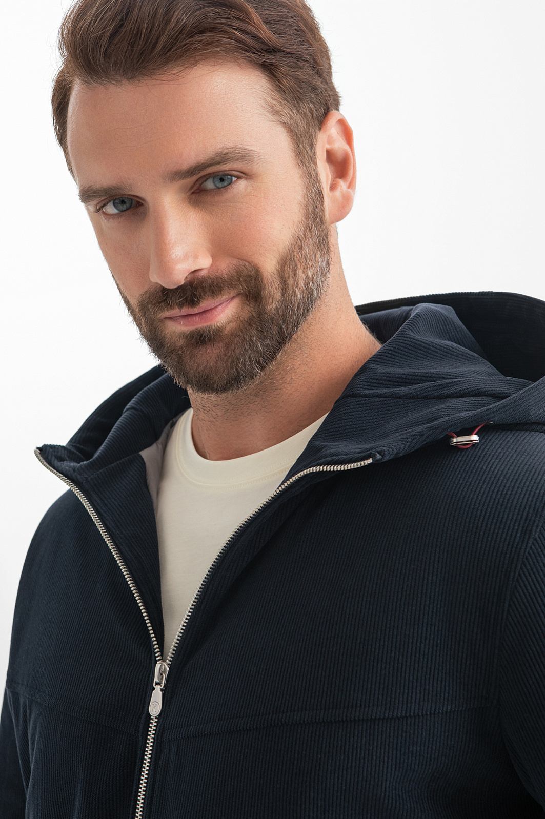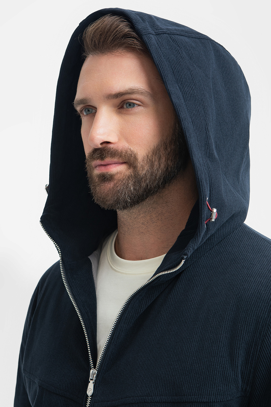 Костюм KANZLER из коллекции Limited Еdition сшит из темно-синего вельвета — материала, который ассоциируется с королевской роскошью, теплом и уютом. Он согреет тело и душу во время утренней или вечерней прогулки. Верх представляет собой куртку с теплой стеганной подкладкой и капюшоном. Застежки-молнии из белого металла добавляют ей урбанистического шика. Низ — удобные и элегантные брюки-карго, в которых практически не угадывается военное происхождение. Дизайнеры не только ввели их в гражданский обиход, но и придали элегантный и светский вид. То и другое вместе — хороший выбор для любых вариантов активного отдыха на свежем воздухе.