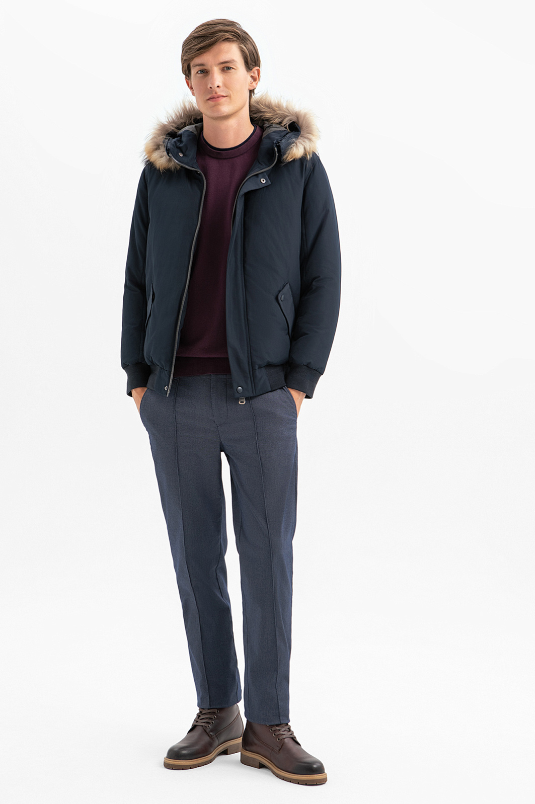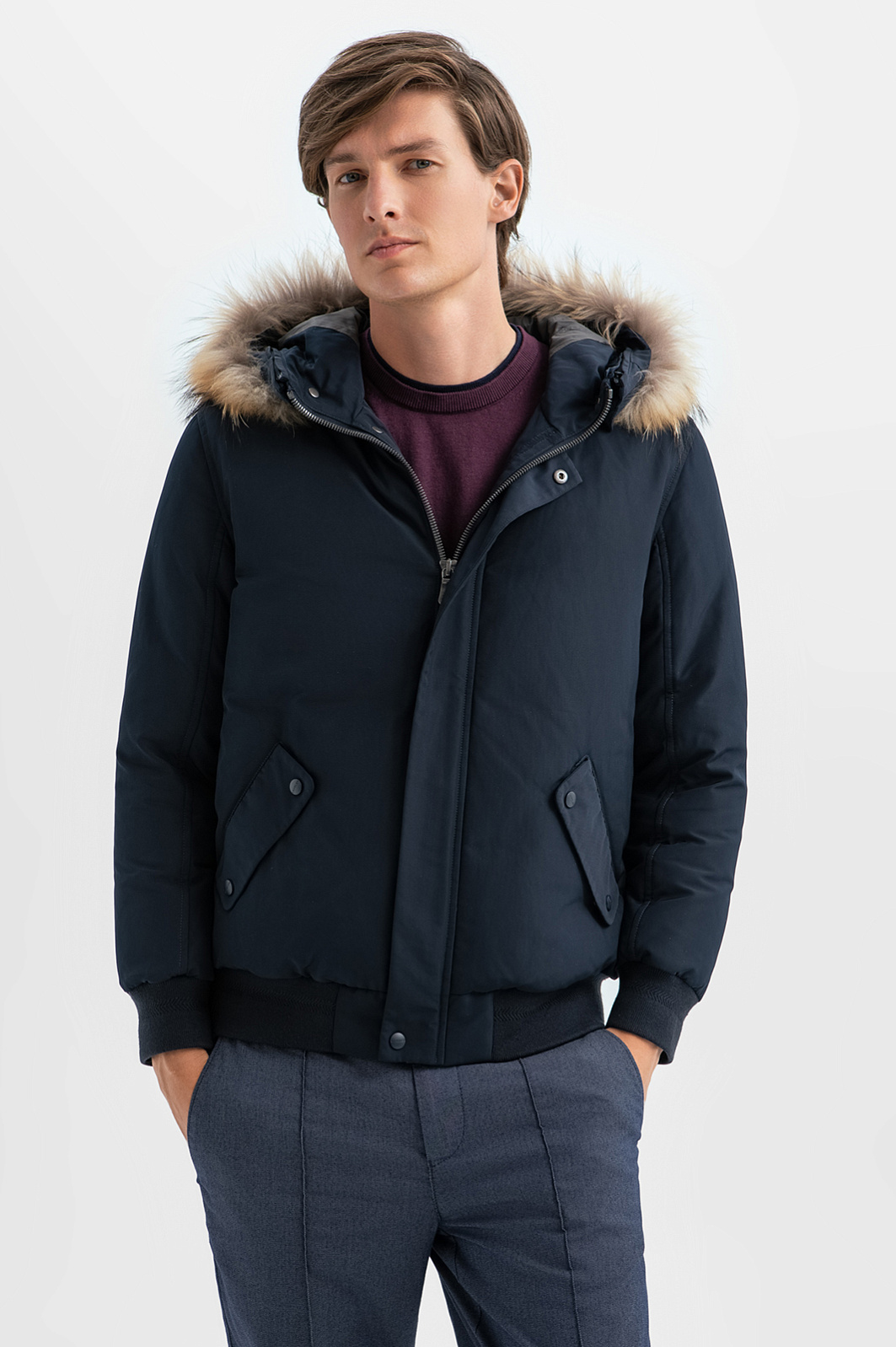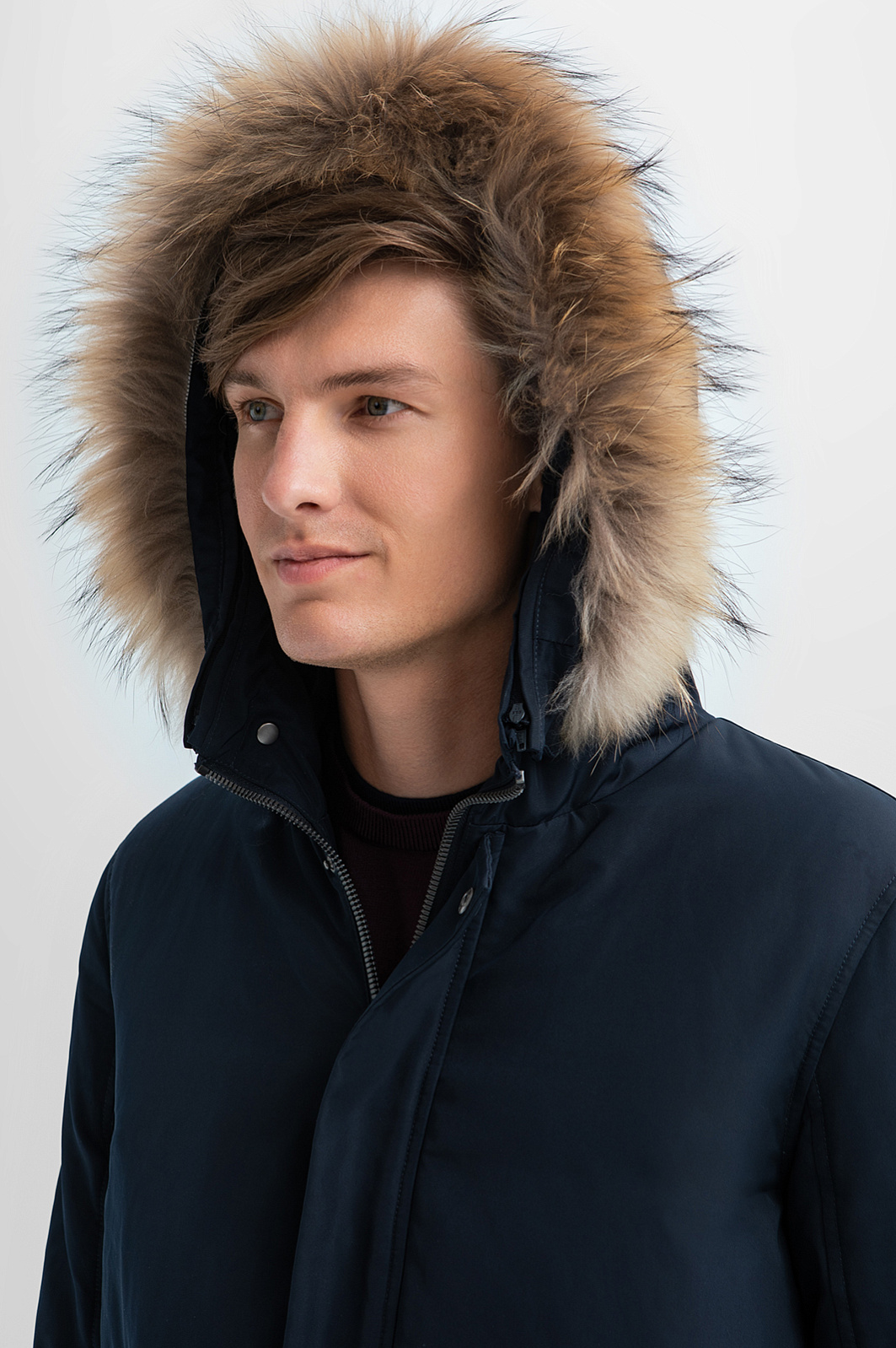 Темно-синяя куртка KANZLER представляет собой вариацию утепленного бомбера с капюшоном. Функциональные детали гармонично сочетаются с отделкой из меха енота, которая придает куртке романтические черты, связанные с образами первопроходцев и золотоискателей. Под прочным водоотталкивающим материалом из полиэстера скрывается теплейший натуральный наполнитель (пух и перо). Внутренняя часть выполнена из практичного полиамида. Боковые карманы с клапанами согреют руки. Внутренний карман с молнией — место для хранения важных мелочей. Аккуратную посадку и плотное прилегание обеспечивают широкая плотная трикотажная резинка на рукавах и по нижнему краю куртки. Параметры модели: рост 191, 97-77-99 Размер на модели: 50