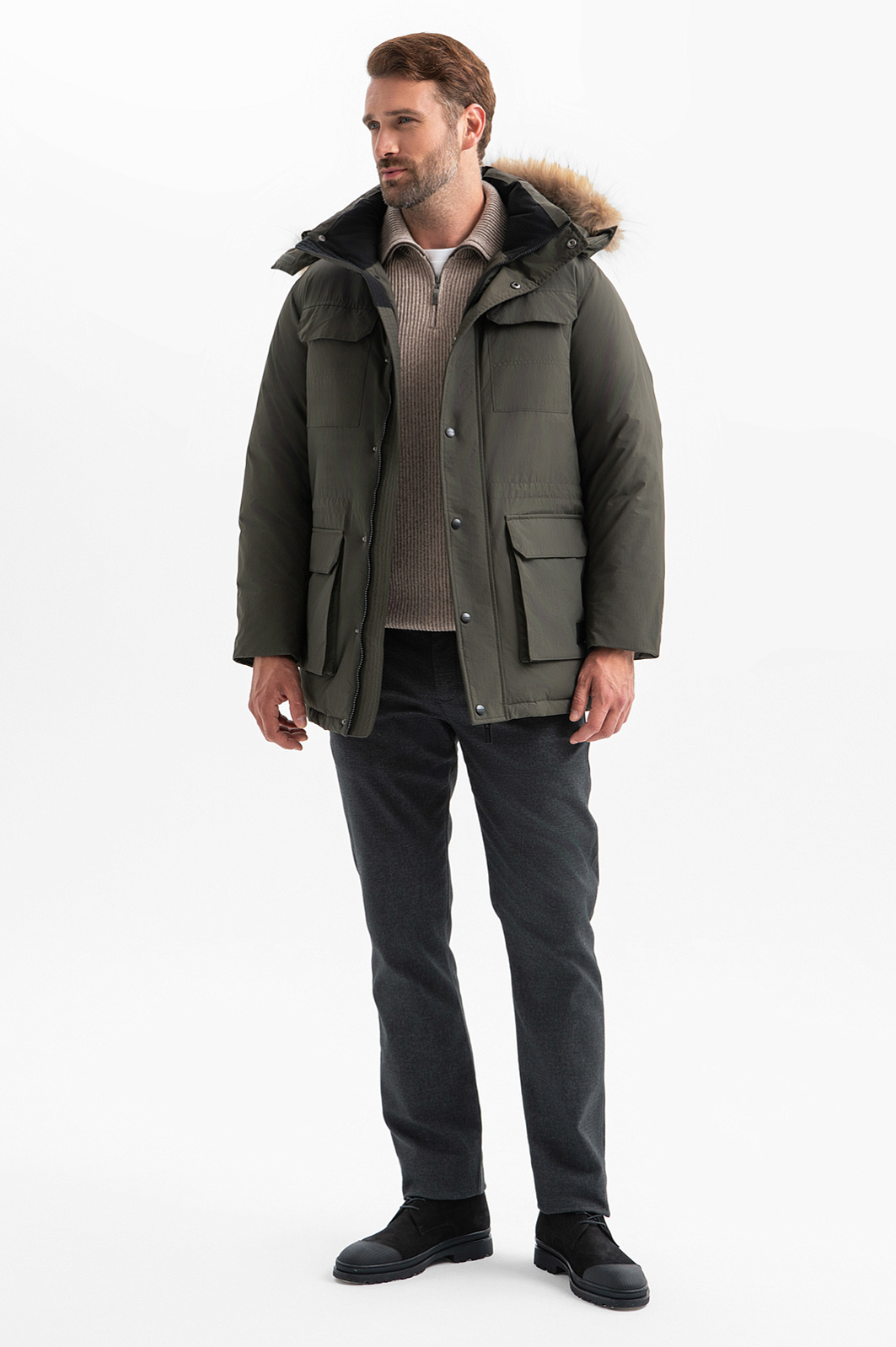 Теплая куртка-аляска KANZLER оттенка хаки с капюшоном, отделанным мехом енота, позволяет наслаждаться прогулками на свежем воздухе при температуре до -30℃. Модель дополнена функциональными деталями: большие карманы с клапанами, съемный капюшон с ремешком, кулиска на линии талии для регулирования прилегания, широкая планка с кнопками, прикрывающая застежку-молнию. Это удобная многофункциональная модель, которая сочетается с формальной одеждой и вещами в стилях кежуал и спорт. Внешний слой состоит из прочнейшего полиамида с водоотталкивающей обработкой. Под ним — практичный утепляющий слой из полиэстера. Параметры модели: рост 189, 102-80-99 Размер на модели: 50