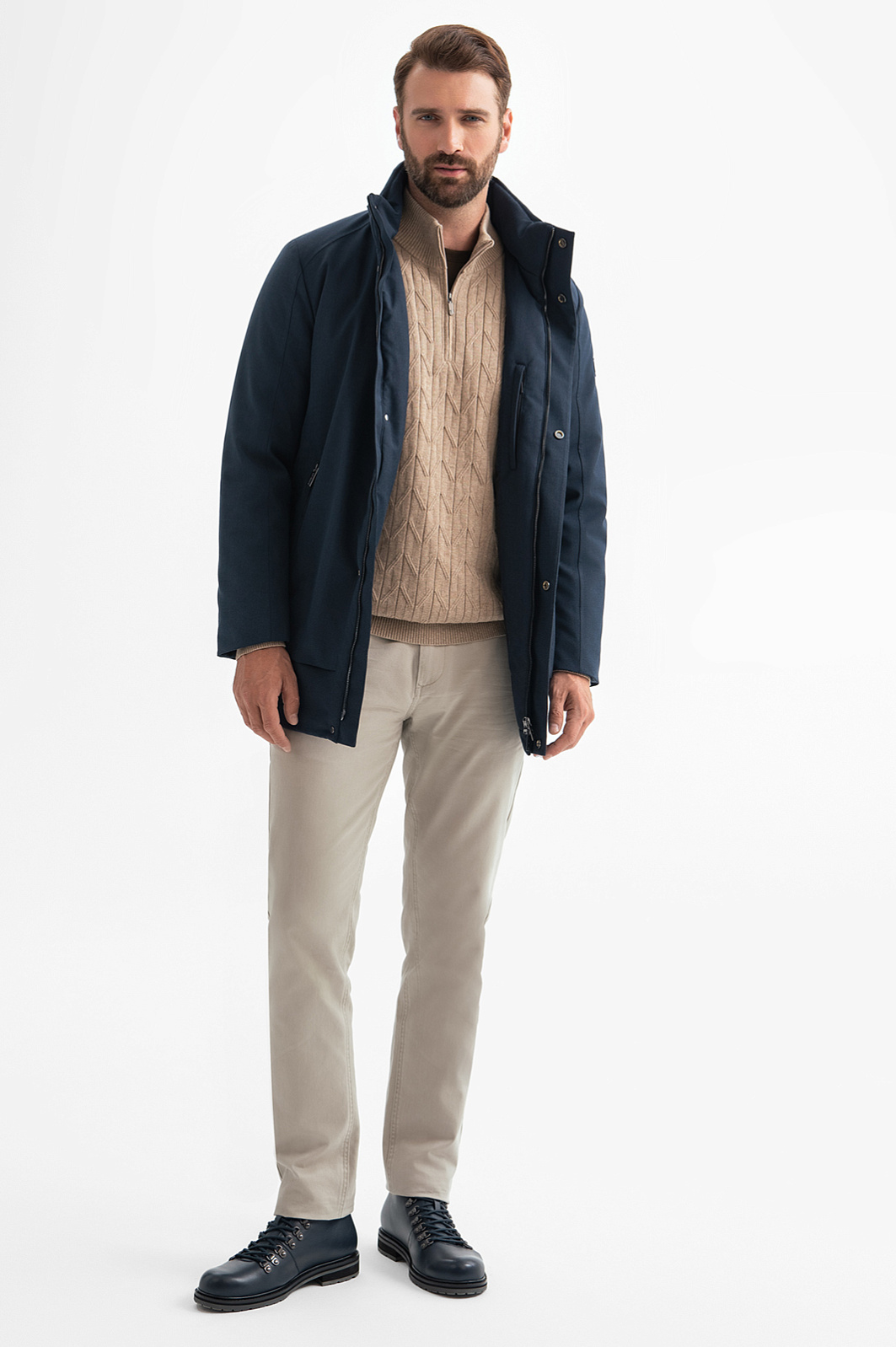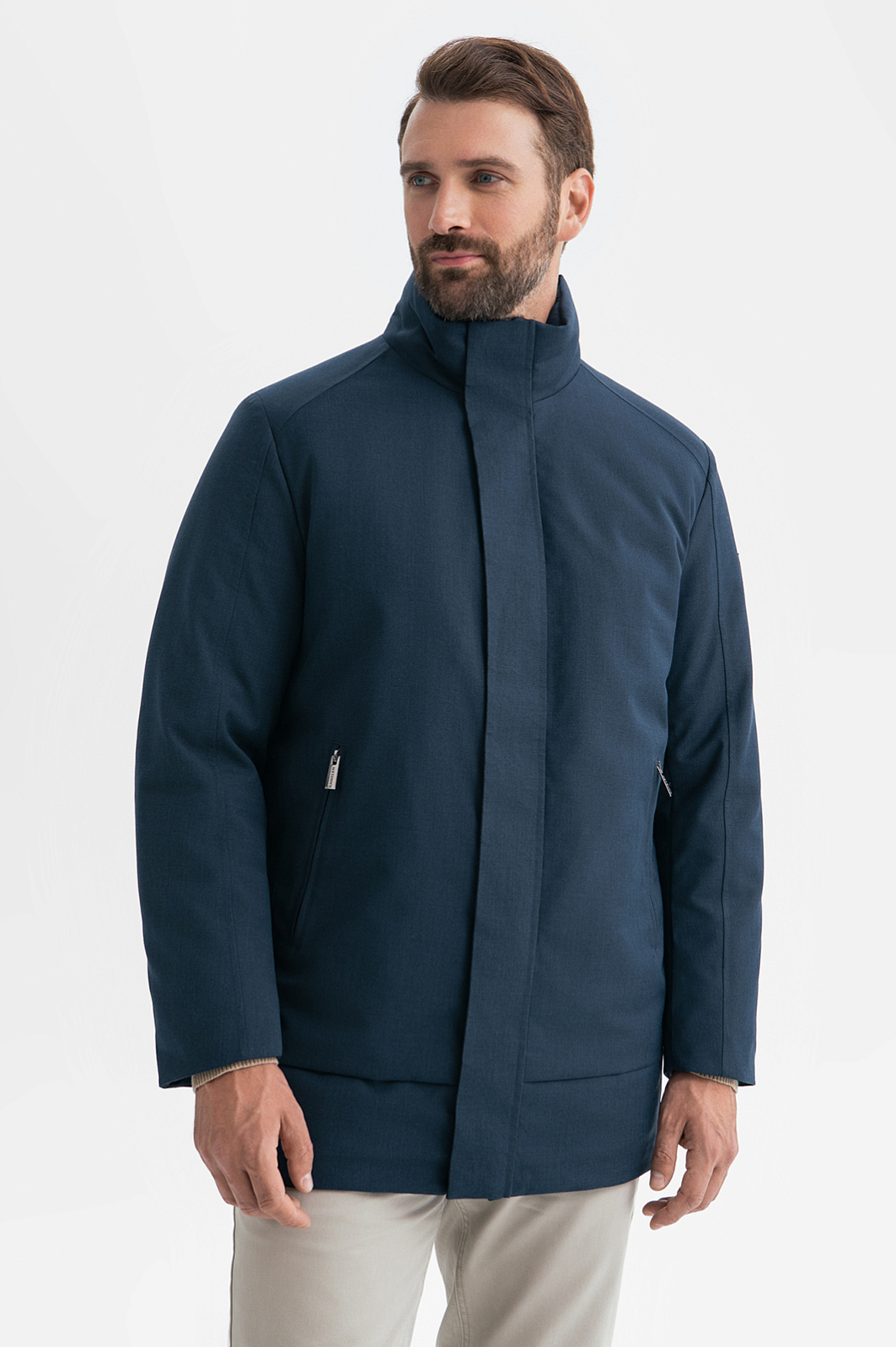 Куртка KANZLER с водоотталкивающей обработкой. Прямая лаконичная модель, длиной до бедра, в меру свободная для комфорта движений. Она оптимально подойдет мужчинам, которые проводят много времени в автомобиле или любителям долгих прогулок. Модель выполнена из тактильно приятного ворсистого материала в модном оттенке классического темного денима. Специальная обработка ткани с водоотталкивающей пропиткой защищает от дождя, а высокий воротник практично закрывает шею от ветра и холода. Модель застегивается на прочную металлическую молнию, которая скрыта планкой на молнии и дополняет минималистичный дизайн изделия. Для важных мелочей предусмотрели глубокие функциональные карманы на молнии. В качестве декора дизайнеры добавили небольшой металлический патч с логотипом бренда. Параметры модели: рост 189, 102-80-99 Размер на модели: 50