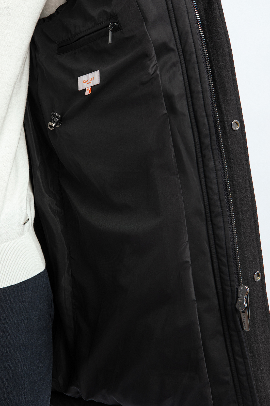 Теплая черная парка KANZLER выполнена из смесового хлопкового материла с водоотталкивающей обработкой. Внутри — наполнитель из полиэстера, сохраняющий тепло. Карманы — пара верхних, пара нижних, с клапанами, и один на рукаве, на молнии, — придают куртке функциональный урбанистический вид. Еще один карман внутри служит для хранения документов и других важных мелочей. Несъемный капюшон с подкладкой из искусственного меха защищает дождя, снега и ветра. Степень прилегания регулируется шнурком со стоппером. Удлиненная универсальная куртка отлично сочетается с одеждой в деловом, повседневном и спортивном стилях. Параметры модели: рост 192, 101-76-97 Размер на модели: 50