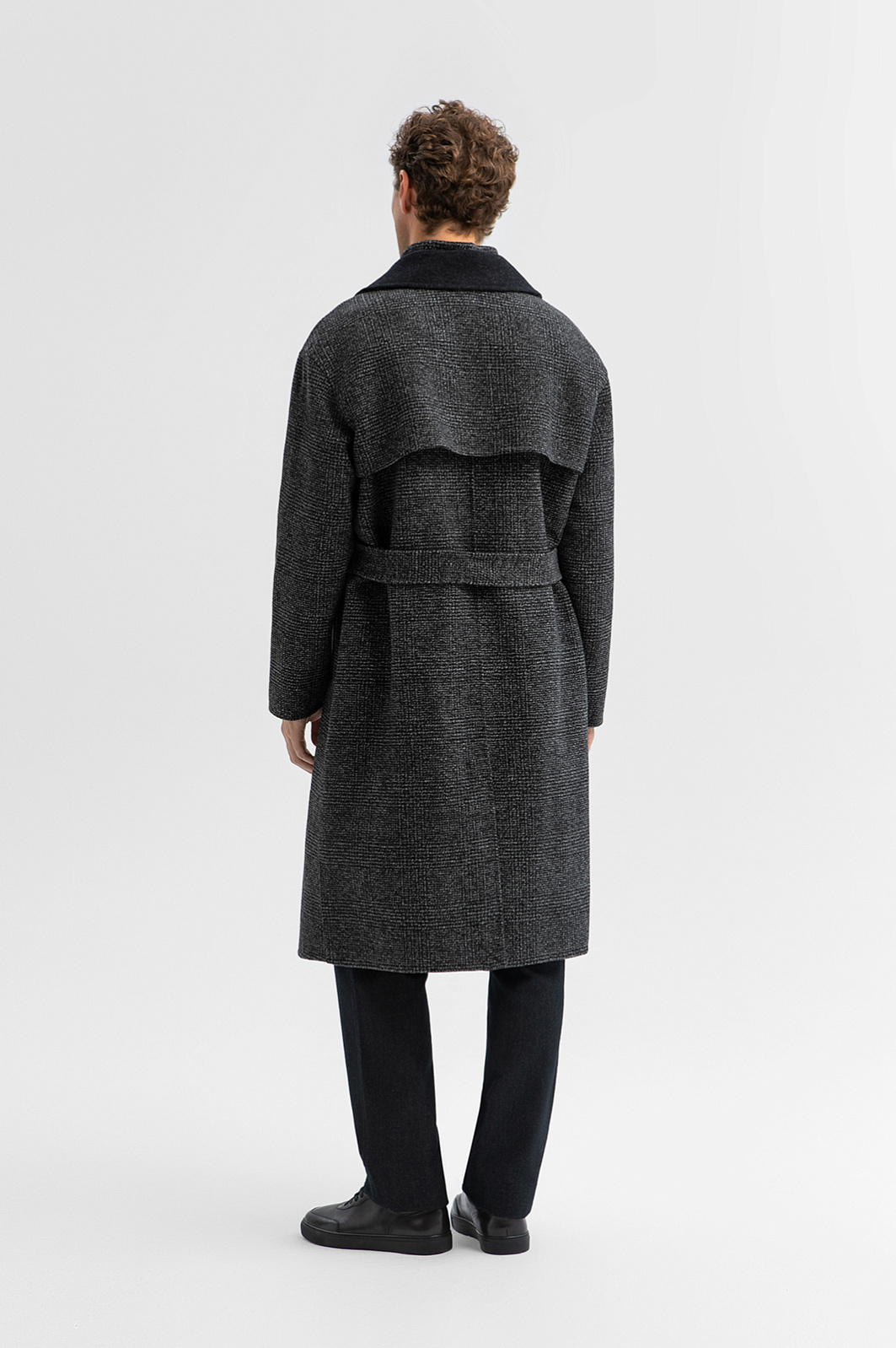 Двубортное пальто KANZLER в мелкую черную клетку из смесовой шерсти прямого кроя с поясом — результат современного подхода к дизайну, основанного на формуле: городской стиль + уникальность + функциональность. Это трансформируемая модель «два в одном», элементы которой (пальто и жилет) можно носить вместе и по отдельности, а пальто — с поясом и без. Двубортная застёжка и широкие чёрные лацканы придают образу основательность и архитектурную чёткость, а кокетка на спинке, отсылающая к силуэту плаща, добавляет динамики. Внутри — аккуратный жилет с высоким горлом на двухзамковой молнии. Мелкая черная клетка на ткани придает модели сдержанность. Материал из смесовой шерсти (70% шерсть, 30% полиэстер) хорошо сохраняет тепло и практически не мнется. Параметры модели: рост 188, 97-82-92 Размер на модели: 50