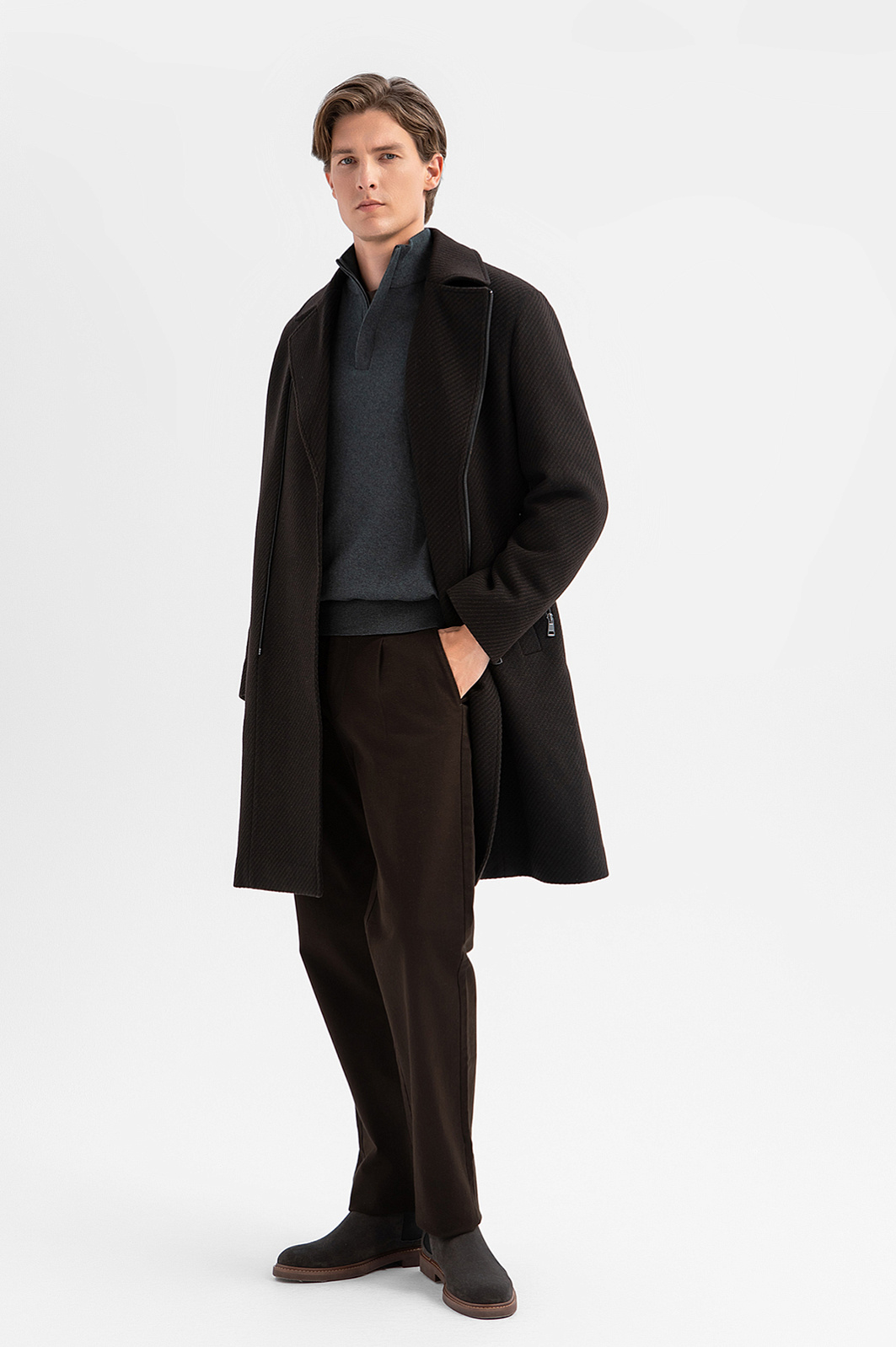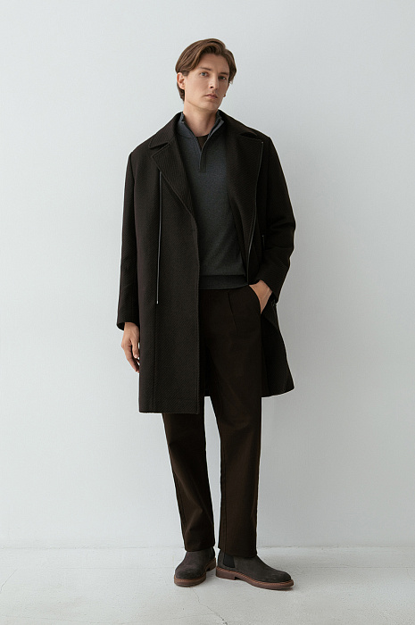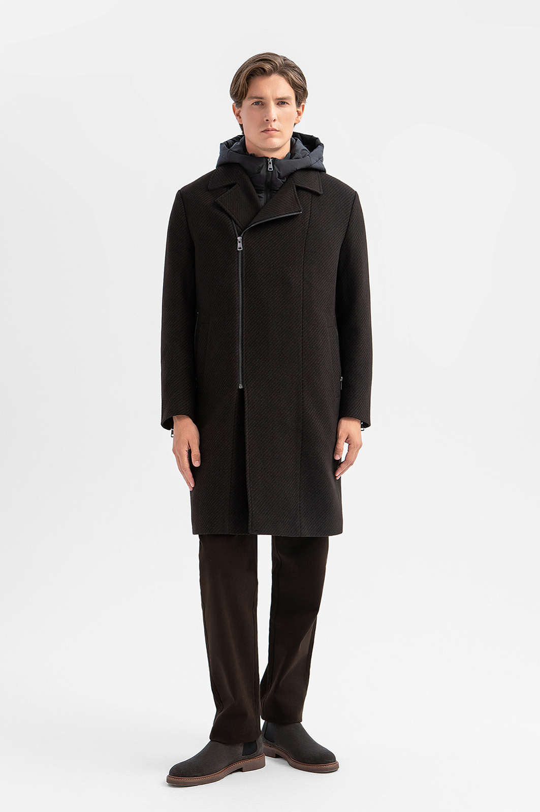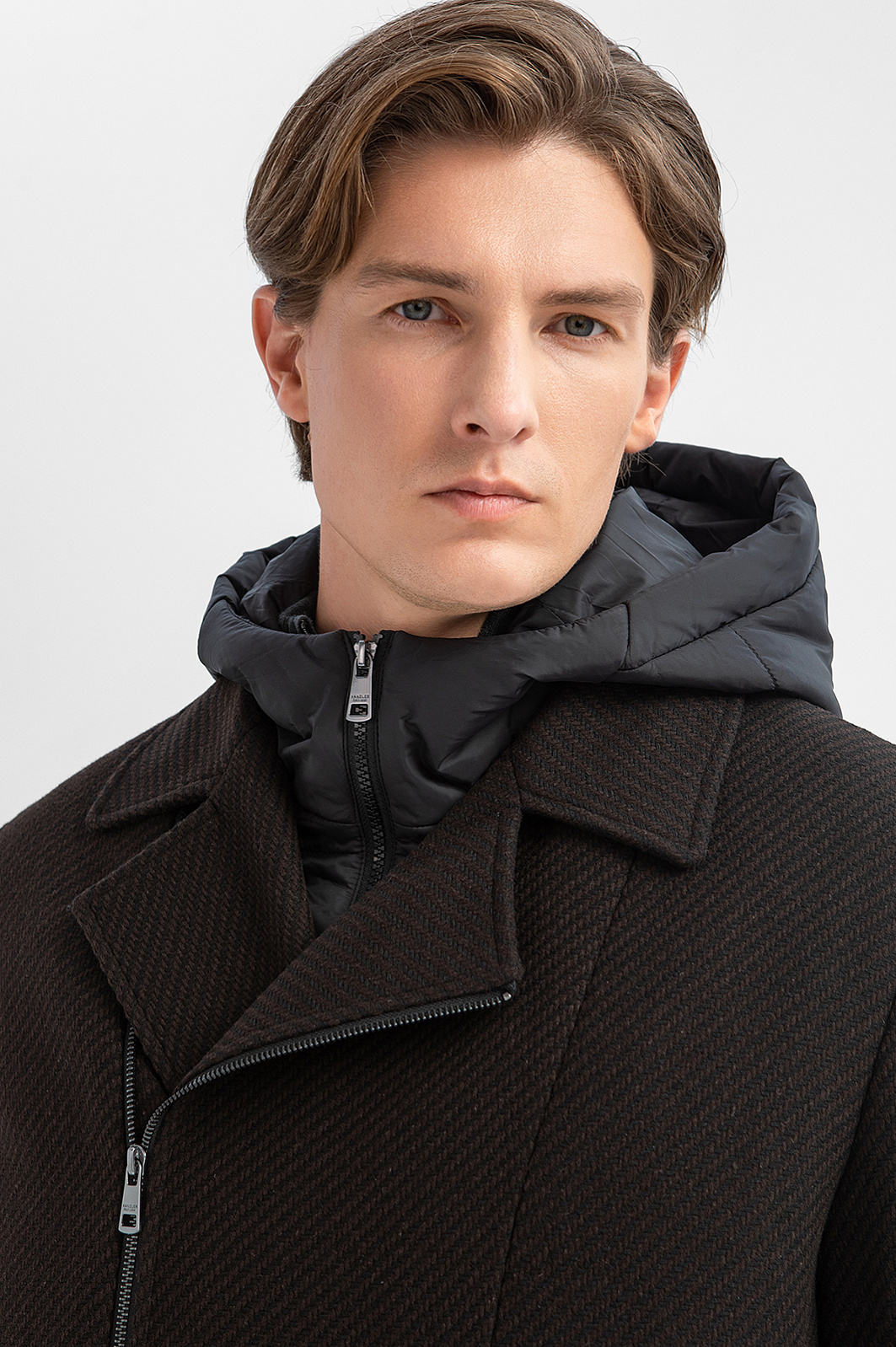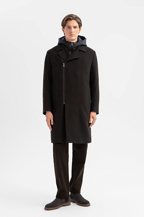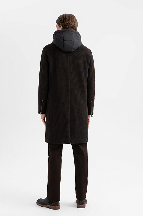 Утеплённое тёмно-коричневое пальто KANZLER прямого кроя из смесовой шерсти превосходит любые ожидания благодаря креативному дизайну и продуманным функциональным деталям. Это по-настоящему универсальная модель, подходящая для города, поездок и путешествий. Короткая асимметричная застёжка и молнии на рукавах и карманах служат стильными акцентами. Манишка с капюшоном защищает от холода и ветра. Если же погода налаживается, её легко отстегнуть. Фактурный диагональный рубчик придаёт ткани выразительность. Материал выполнен из практичной смесовой шерсти и утеплён лёгким полиэстеровым наполнителем, что позволяет не отказывать себе в прогулках в холодное время года — пальто защитит от морозов до –15 °C. Параметры модели: рост 191, 97-77-99 Размер на модели: 50
