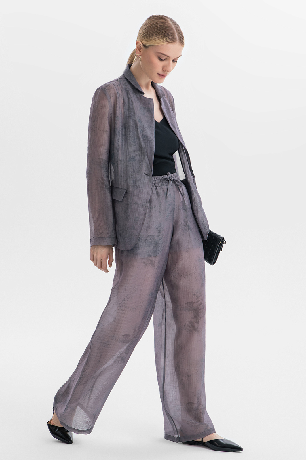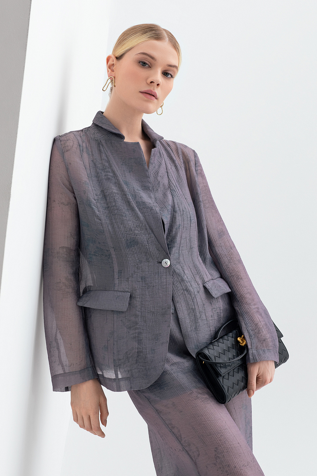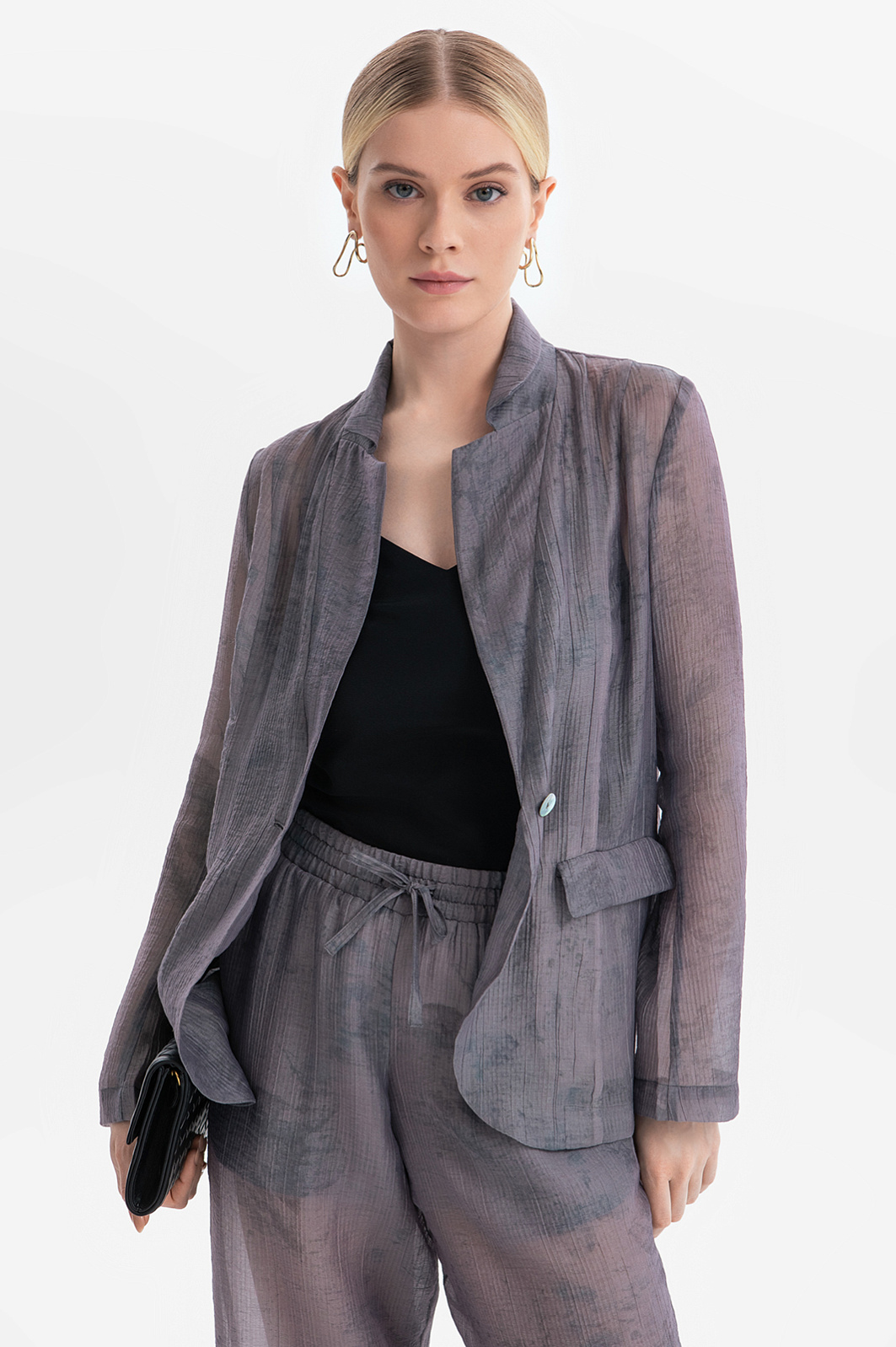 Пиджак KANZLER из серого полупрозрачного фактурного тенсела с легким растительным принтом создает флер таинственности, балансируя на грани видимого и скрытого. Это стильная и роскошная вещь для повседневной жизни и вечерних выходов. Слегка приталенный крой и мягкие очертания подчеркивают достоинства женственной фигуры. Красивая фактурная ткань окутывает тело плотной дымчатой вуалью. Смесовый материал сделан из мягкого нежного тенсела, который хорошо пропускает воздух и сохраняет естественное тепло тела, и прочного износоустойчивого полиамида.