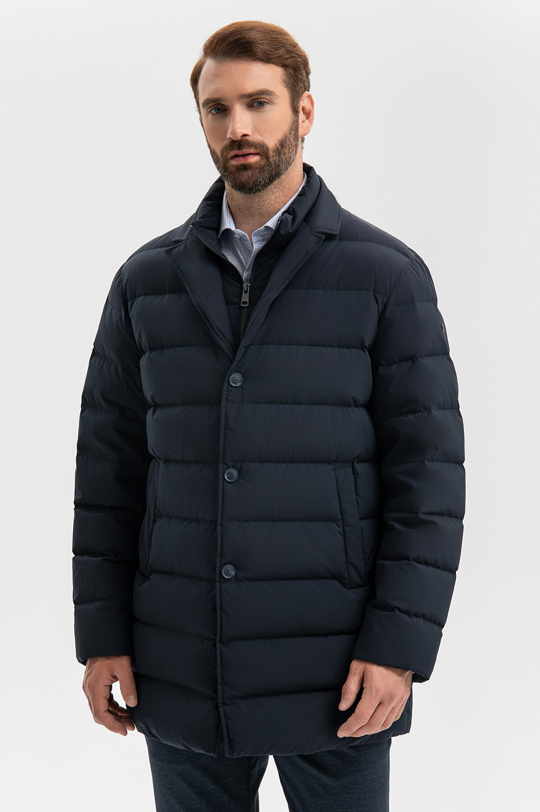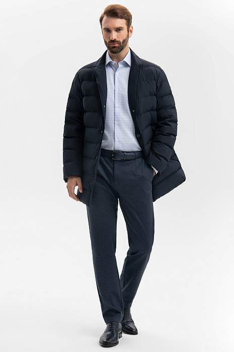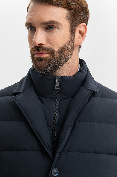 Темно-синий стеганый пуховик KANZLER — современная удобная верхняя одежда, которая, в зависимости от ситуации и погодных условий, может трансформироваться (манишку с высоким горлом на молнии можно отстегивать). Лаконичный прямой крой и детали — пуговицы и английский воротник — добавляют пуховику элегантности, которая не противоречит комфорту и функциональности. В боковых карманах можно согреть руки. Вместительный внутренний карман на молнии пригодится для хранения важных мелочей — карточек, пропусков, документов. Внешний слой и подкладка сделаны из плотного непродуваемого полиэстера с водоотталкивающей обработкой, защищающей от дождя и снега. В качестве утеплителя используется утиный пух с пером — теплый натуральный материал, который хорошо согревает в холодные дни. Параметры модели: рост 189, 102-80-99 Размер на модели: 50