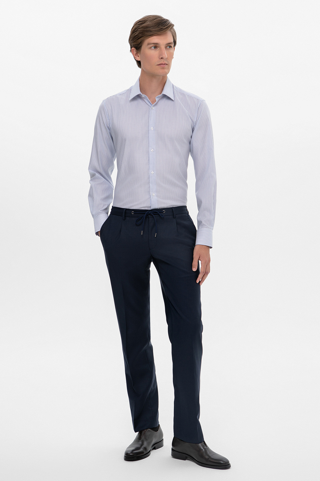 Сорочка KANZLER в тонкую голубую полоску стройнит фигуру и привносит в образ светскую легкость и непринужденность. Изысканный Приталенный крой следует линиям торса, подчеркивая мужественность. Благородная ткань из чистого хлопка воплощает комфорт, что не исключает практичности, долговечности и легкого ухода. Благодаря специальной обработке, натуральный материал практически не мнется. Носить сорочку приятно весь день. Гипоаллергенные воздухопроницаемые волокна сохраняют свежесть и поддерживают приятную для тела температуру. Параметры модели: рост 191, 97-77-99 Размер на модели: 40