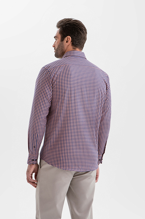 Сорочка KANZLER из хлопка с клетчатым узором, заданным оранжевыми и синими полосами, создает оптимистичное настроение. Такая модель уместна в креативном офисе и на отдыхе — там, где хочется выглядеть ярко и стильно. Для создания непринуждённых многослойных образов её можно носить нараспашку, надев с футболкой или майкой. Свободный прямой крой не ограничивает движения и обеспечивает естественную посадку. Приятная к телу ткань из чистого хлопка спасает от перегревания в жаркие дни. Натуральные гипоаллергенные волокна хорошо пропускают воздух, защищают кожу от избыточного ультрафиолета и поддерживают комфортную температуру.