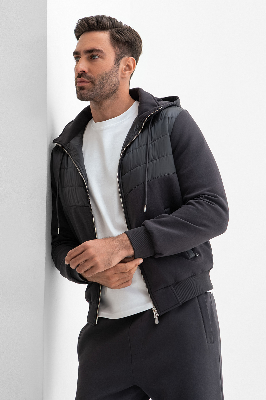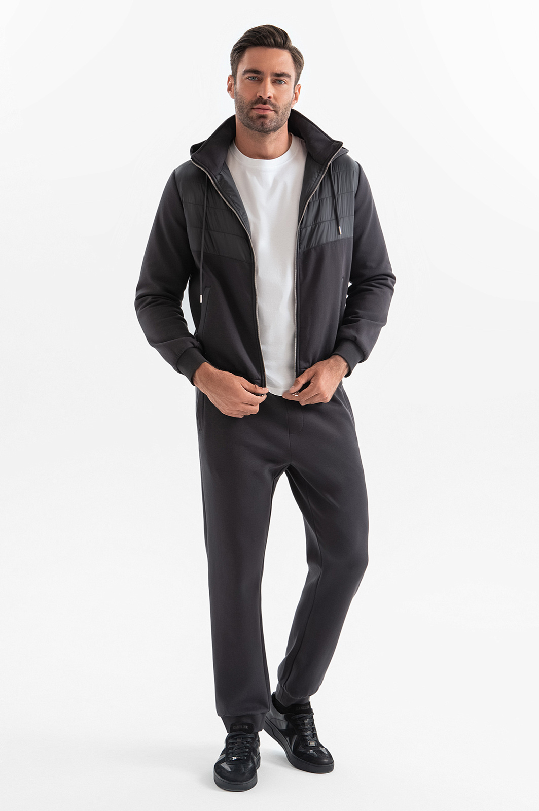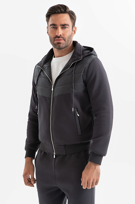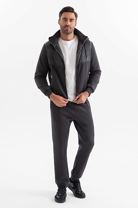 Спортивный костюм KANZLER универсального графитового оттенка вдохновляет на регулярные тренировки и прогулки на свежем воздухе. Основная часть толстовки создана из дышащего смесового хлопка. Грудь, спинка и капюшон выполнены из непродуваемого полиамида, утепленного наполнителем. Благодаря этим вставкам толстовка отлично защищает от ветра и осадков, выполняя роль легкой куртки для межсезонья. Толстовка дополнена джоггерами с кулиской и карманами на молнии, которые также сшиты из воздухопроницаемого смесового материала. Мягкие хлопковые волокна (80%) поддерживают оптимальный уровень температуры. Полиэстер добавлен для прочности и износоустойчивости, а небольшая доля эластана делает материал растяжимым и помогает сохранять первоначальную форму даже при частых и интенсивных тренировках.
