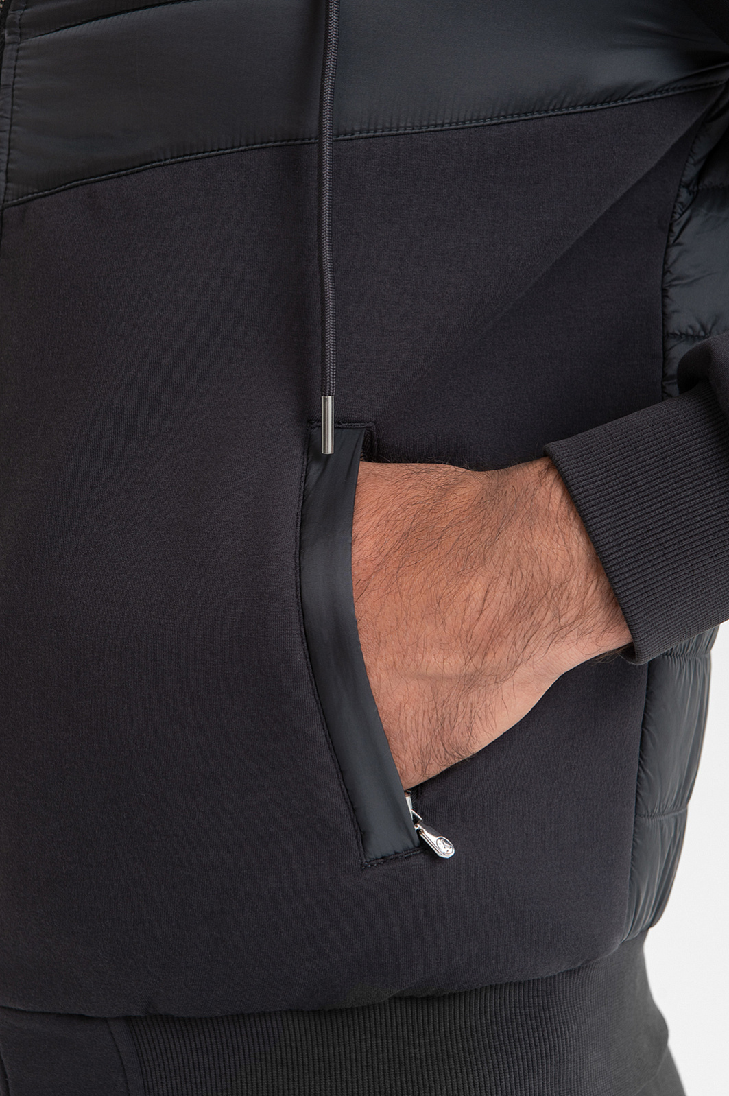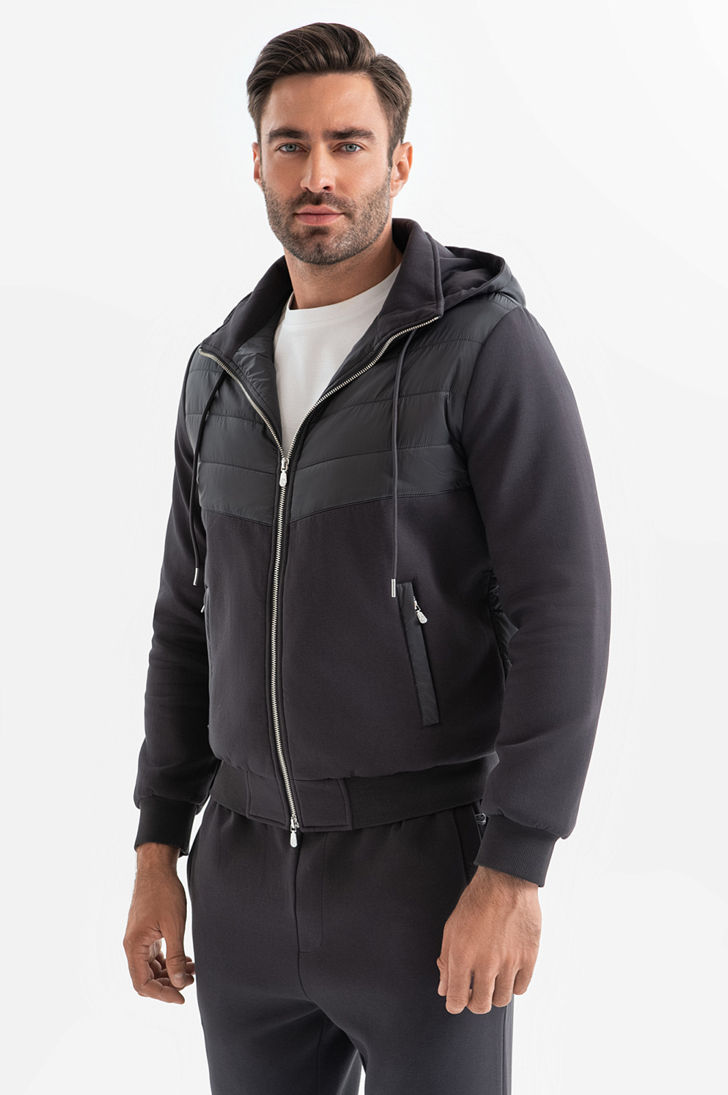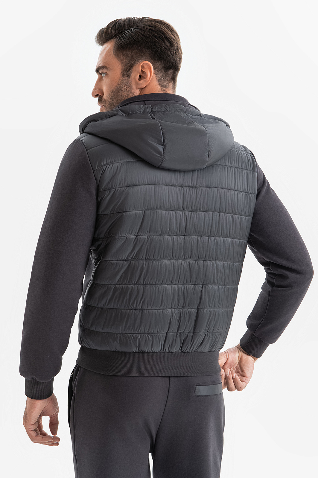 Спортивный костюм KANZLER универсального графитового оттенка вдохновляет на регулярные тренировки и прогулки на свежем воздухе. Основная часть толстовки создана из дышащего смесового хлопка. Грудь, спинка и капюшон выполнены из непродуваемого полиамида, утепленного наполнителем. Благодаря этим вставкам толстовка отлично защищает от ветра и осадков, выполняя роль легкой куртки для межсезонья. Толстовка дополнена джоггерами с кулиской и карманами на молнии, которые также сшиты из воздухопроницаемого смесового материала. Мягкие хлопковые волокна (80%) поддерживают оптимальный уровень температуры. Полиэстер добавлен для прочности и износоустойчивости, а небольшая доля эластана делает материал растяжимым и помогает сохранять первоначальную форму даже при частых и интенсивных тренировках.