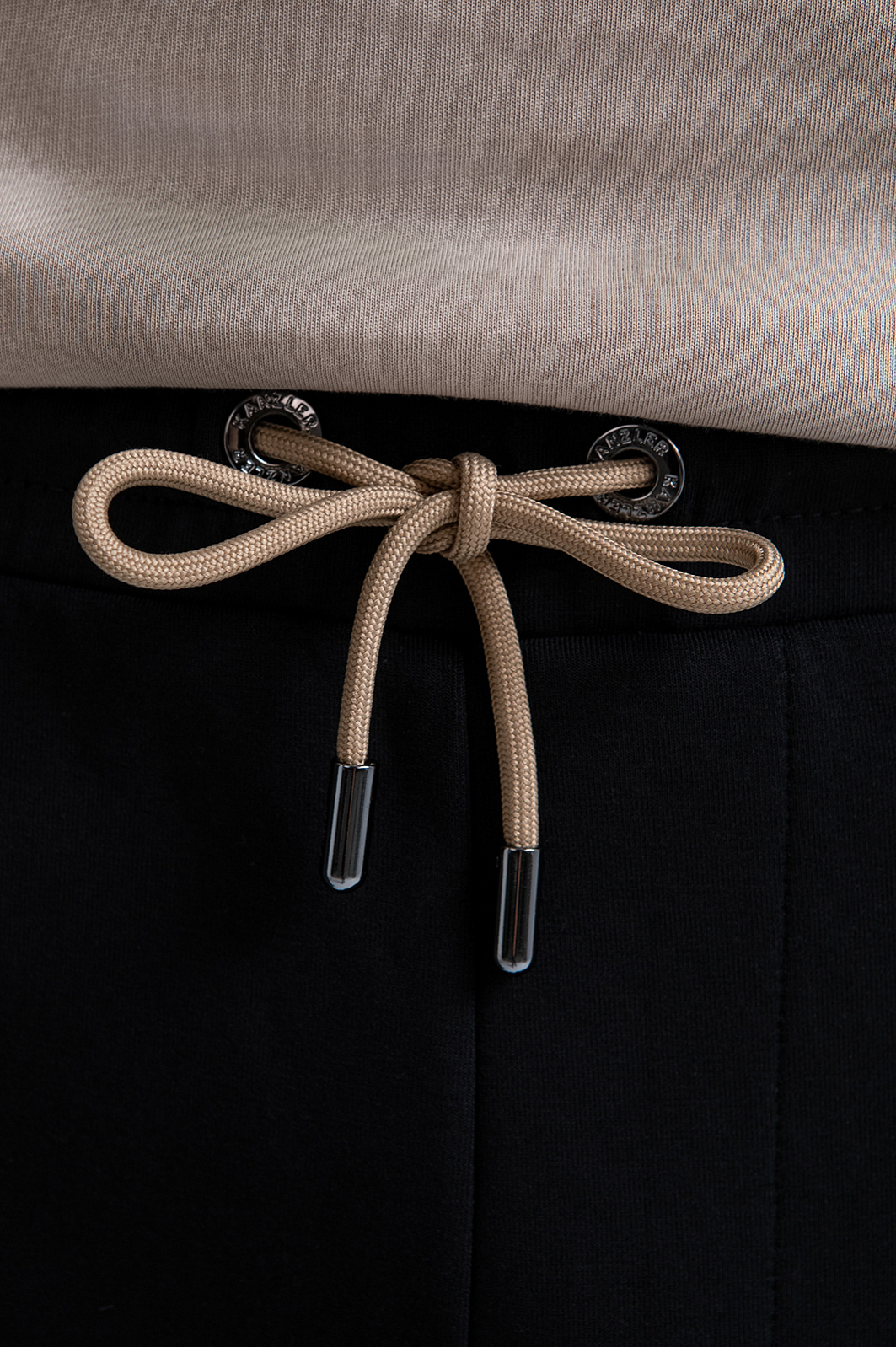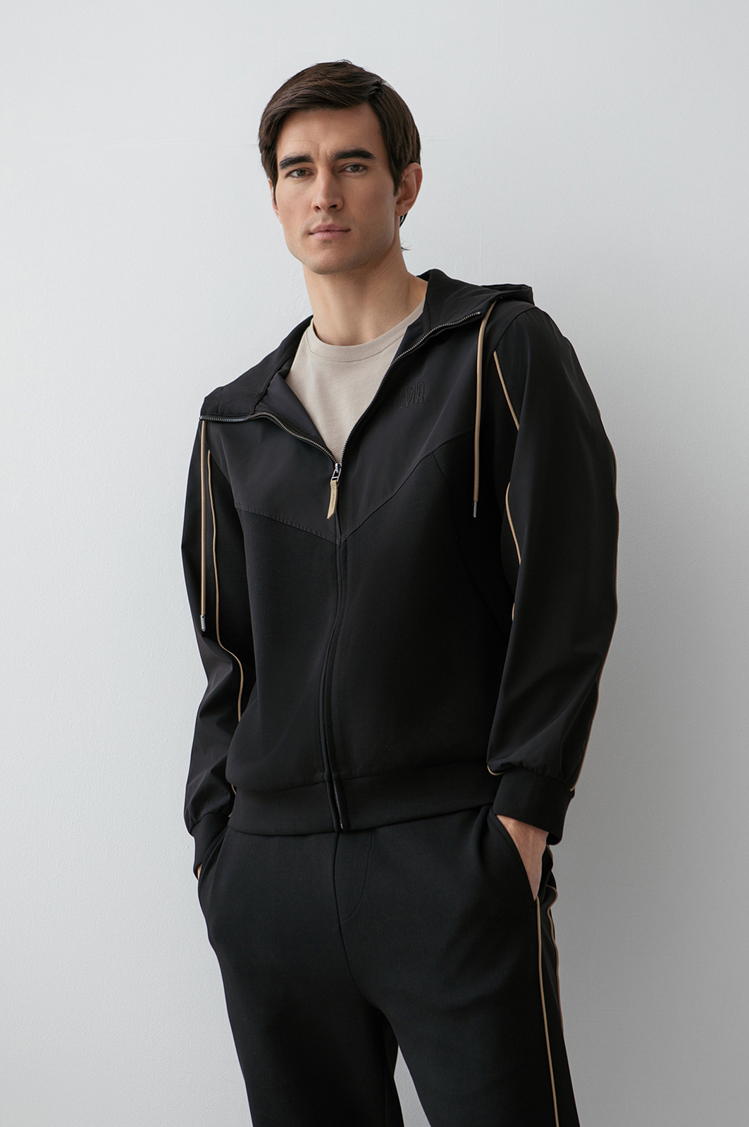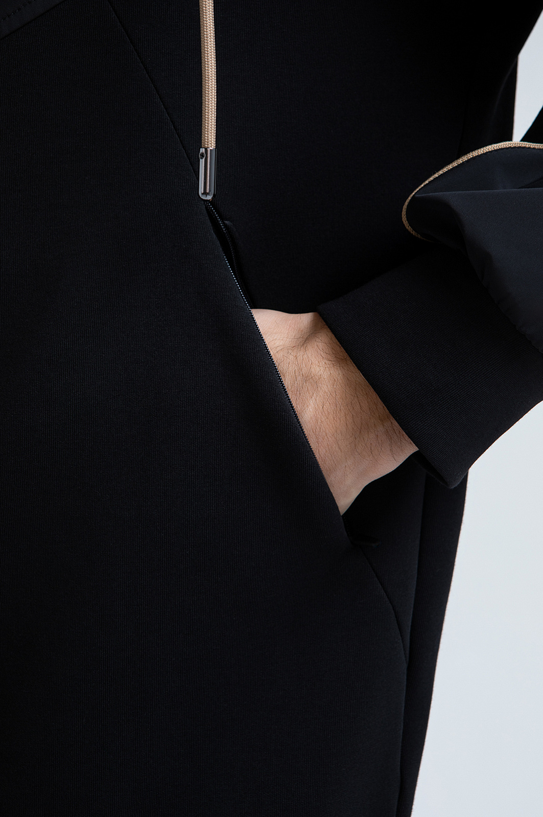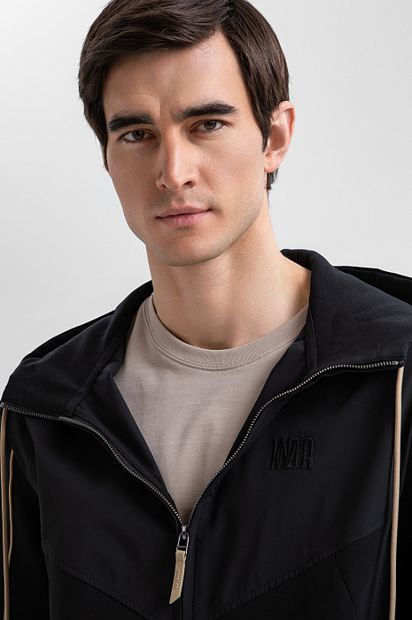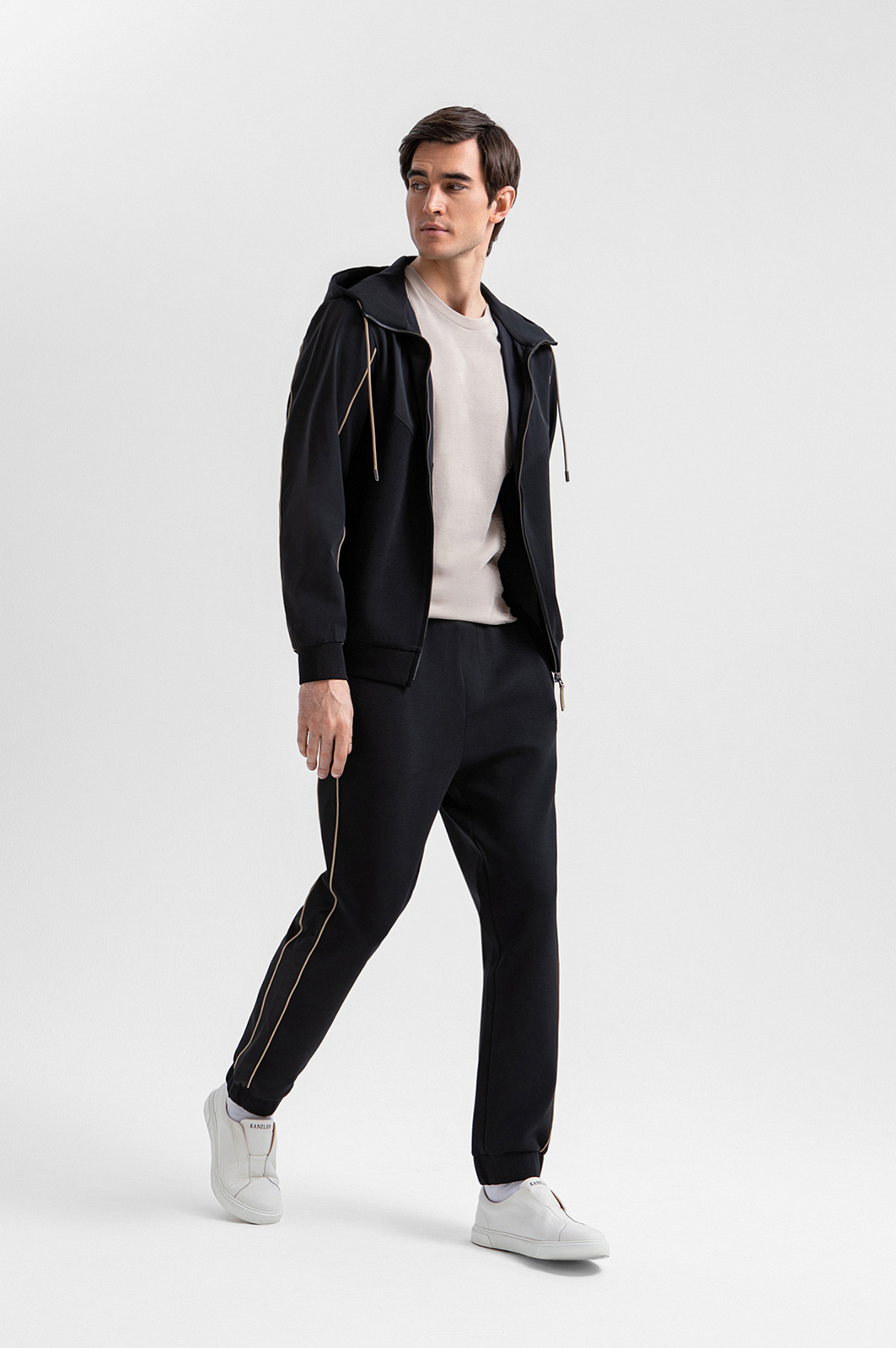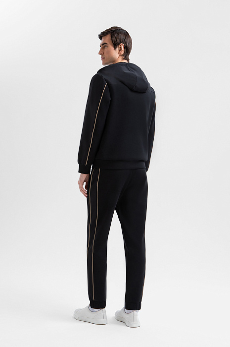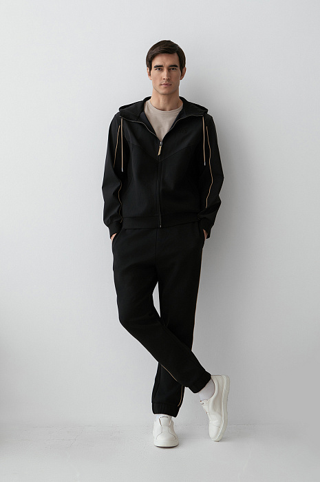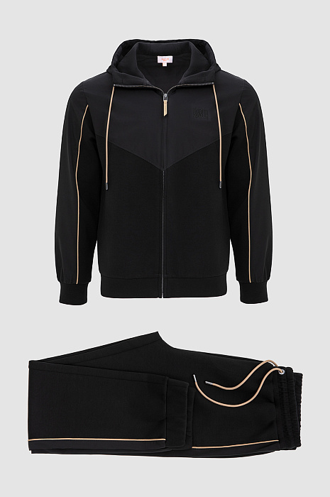 Чёрный костюм KANZLER предназначен для спортивных занятий и непринуждённого отдыха. В комплекте — толстовка на молнии и брюки на кулиске с эластичными манжетами. Трикотаж из смесового хлопка гармонично дополнен деталями из полиэстера, которые подчёркивают геометрию кроя. Контрастные элементы — бежевые шнурки и канты — выступают деликатными акцентами. Материал произведён из хлопка с добавлением синтетических нитей. Натуральные гипоаллергенные волокна поддерживают ощущение свежести и сохраняют естественное тепло. Полиэстер и эластан придают материалу прочность и пластичность.