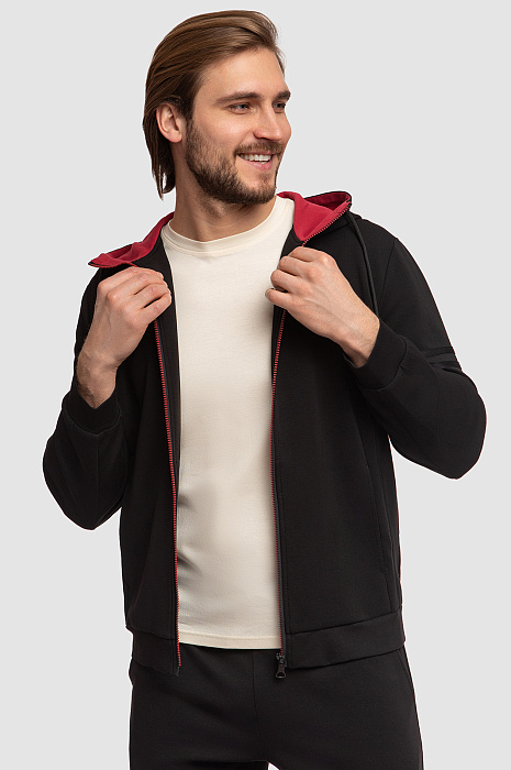 Черная толстовка KANZLER cтанет любимой вещью в практичном мужском гардеробе. На общее стильное впечатление работает базовый черный цвет в паре с красными элементами: объемный капюшон с контрастным внутренним слоем, молния и наконечники. Цветовые контрасты привлекают внимание и расставляют правильные акценты. Модель сшили из мягкого смесового материала на основе натурального хлопка, легкого нейлона и влагоустойчивого эластана. Дышащий трикотаж с плотным переплетением нитей сохраняет тепло тела, поэтому в изделии будет комфортно и в прохладную погоду на улице. Нейлон в составе гарантирует прочность изделия, а также малую сминаемость и устойчивость к растягиванию после стирок и активных видов спорта. Толстовка на молнии станет прекрасной альтернативой ветровке или кардигану в образах в стиле спорт-шик. Параметры модели: рост 187, 100-81-97 Размер на модели: М