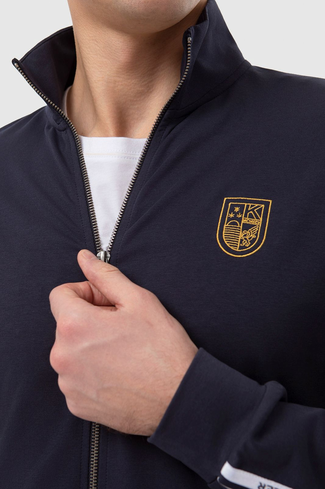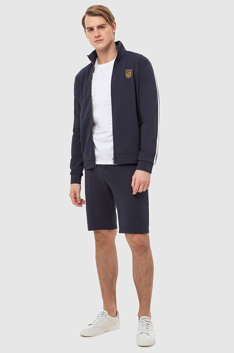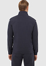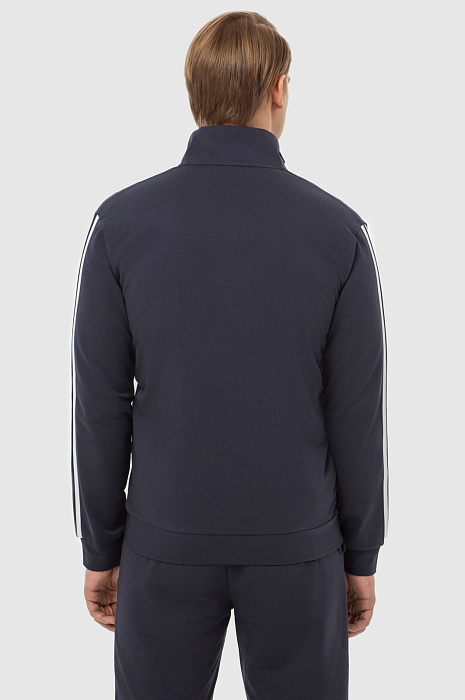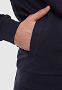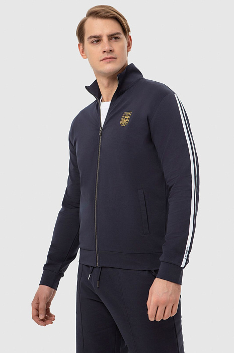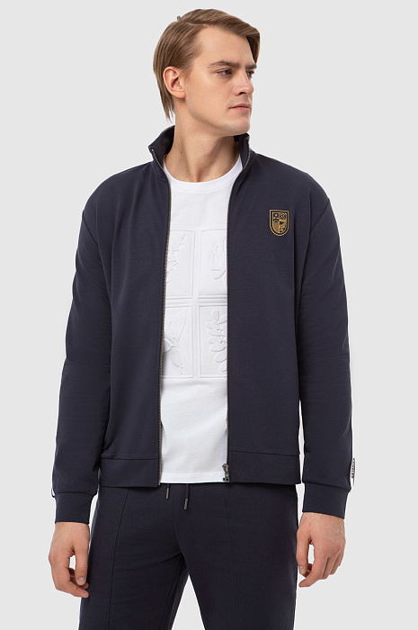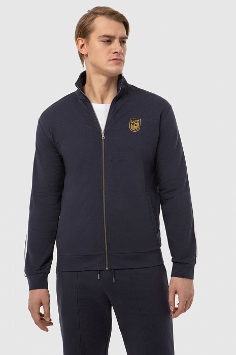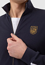 Темно-синяя спортивная толстовка KANZLER на молнии с высоким горлом из мягкого хлопкового материала вдохновляет на активный образ жизни. Универсальная модель подойдет как в качестве спортивной, так и просто удобной одежды в стиле урбан. Толстовку украшает фирменная эмблема, вышитая на груди, и двойная белая полоска-нашивка вдоль рукавов. Боковые карманы вмещают необходимые мелочи — ключи, карточку. Материал из натурального хлопка усилен полиэстером — для прочности, и эластаном — для растяжимости и сохранения формы. Толстовка сочетается со спортивными темно-синими брюками-джоггерами KANZLER.