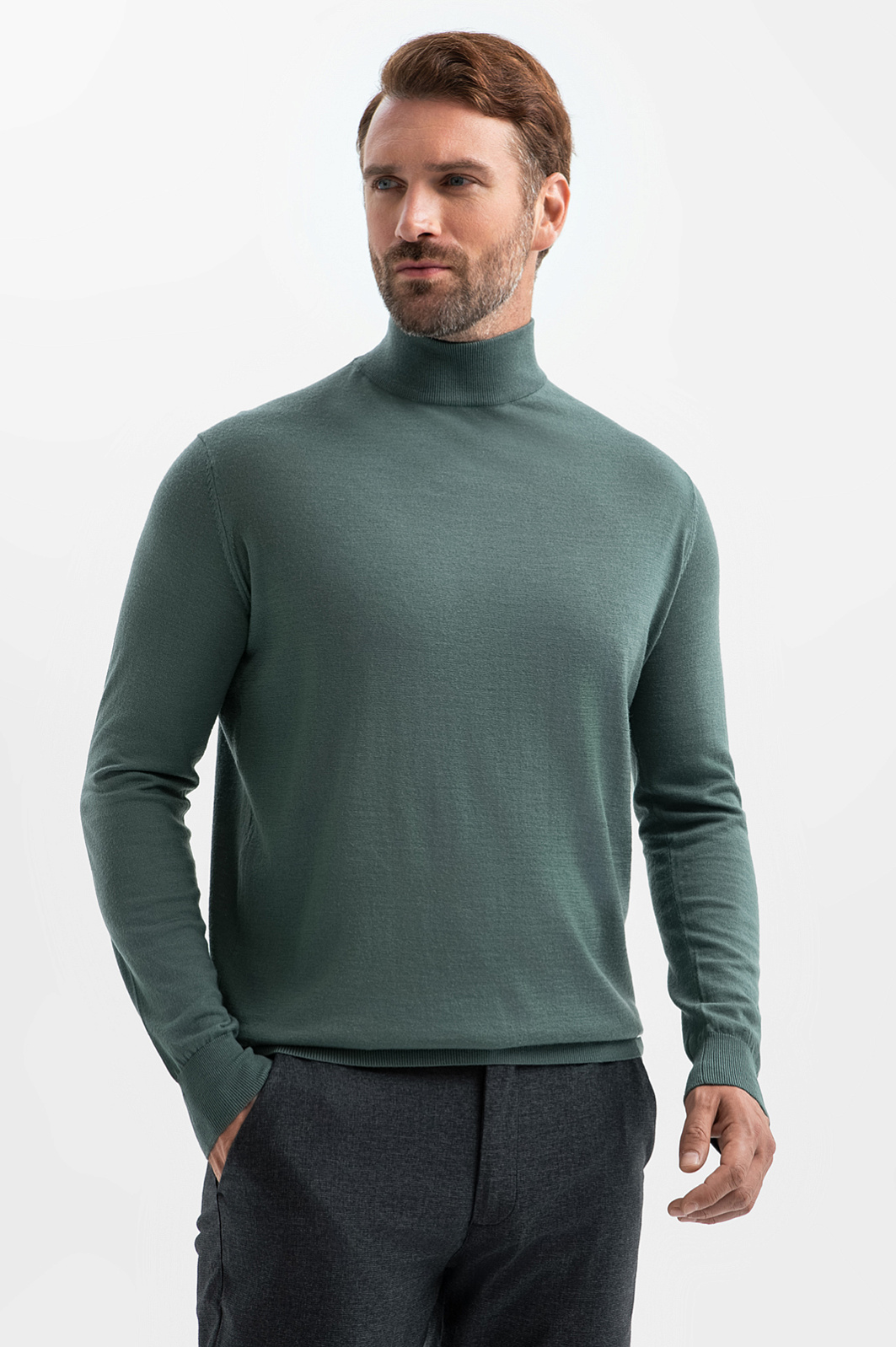 Серо-зеленая водолазка KANZLER из мягкого гладкого шерстяного трикотажа — универсальная вещь для офиса с нестрогим дресс-кодом, путешествий и отдыха. Комбинируя с джинсами, слаксами и вельветовыми брюками можно составить небанальный образ в стиле умный кежуал. В качестве верхнего слоя водолазка подчеркнет достоинства фигуры, а в сочетании с кардиганом или пиджаком — утеплит и добавит образу мягкости. Гладкий материал держит форму, не образовывая складок. Благородная шерстяная ткань удерживает естественное тепло тела, защищая от перепадов температур. Параметры модели: рост 189, 102-80-99 Размер на модели: M