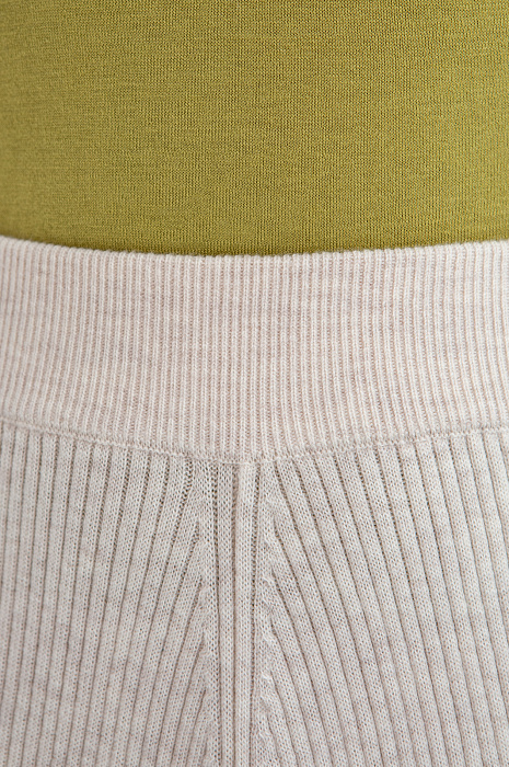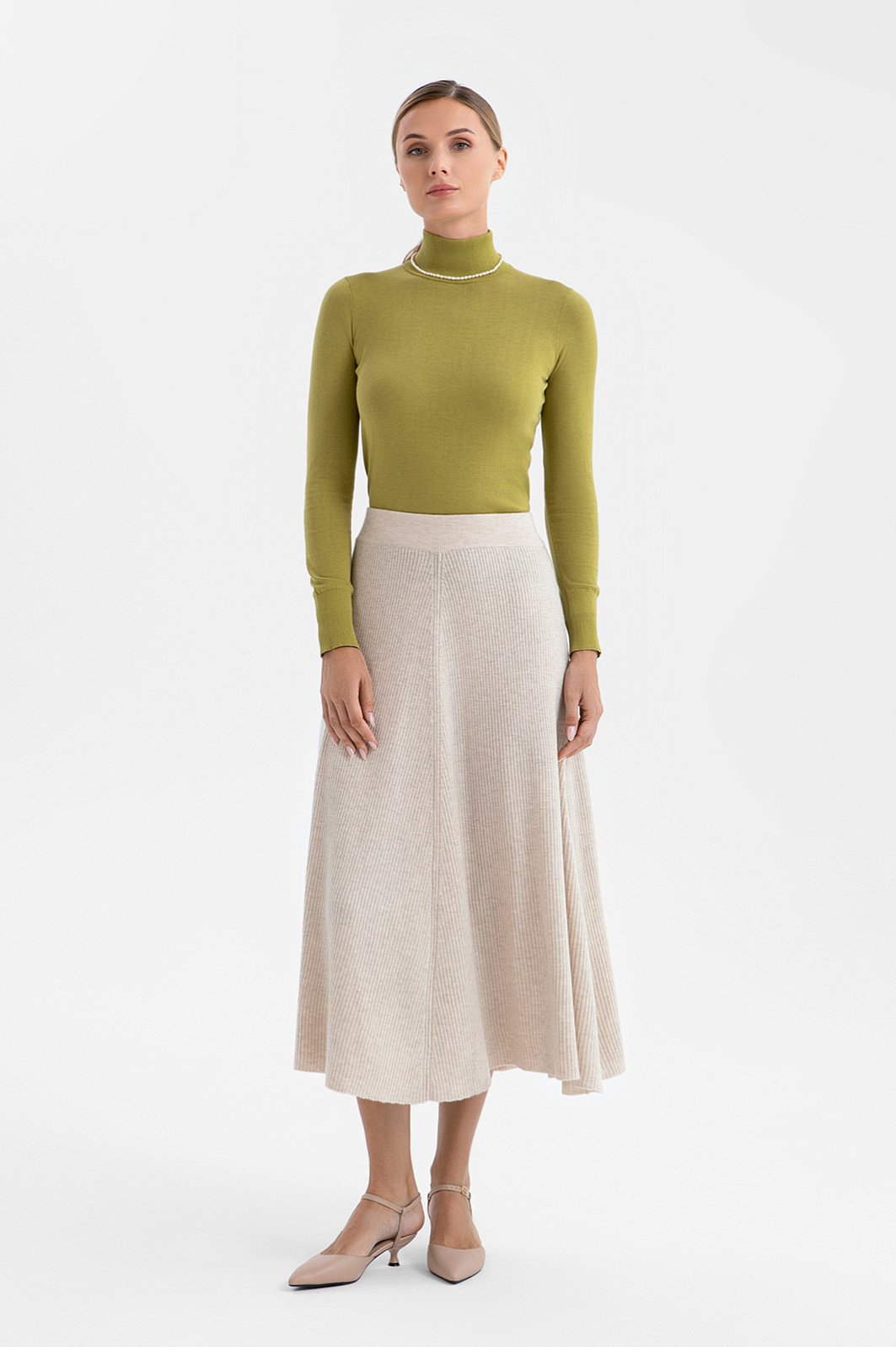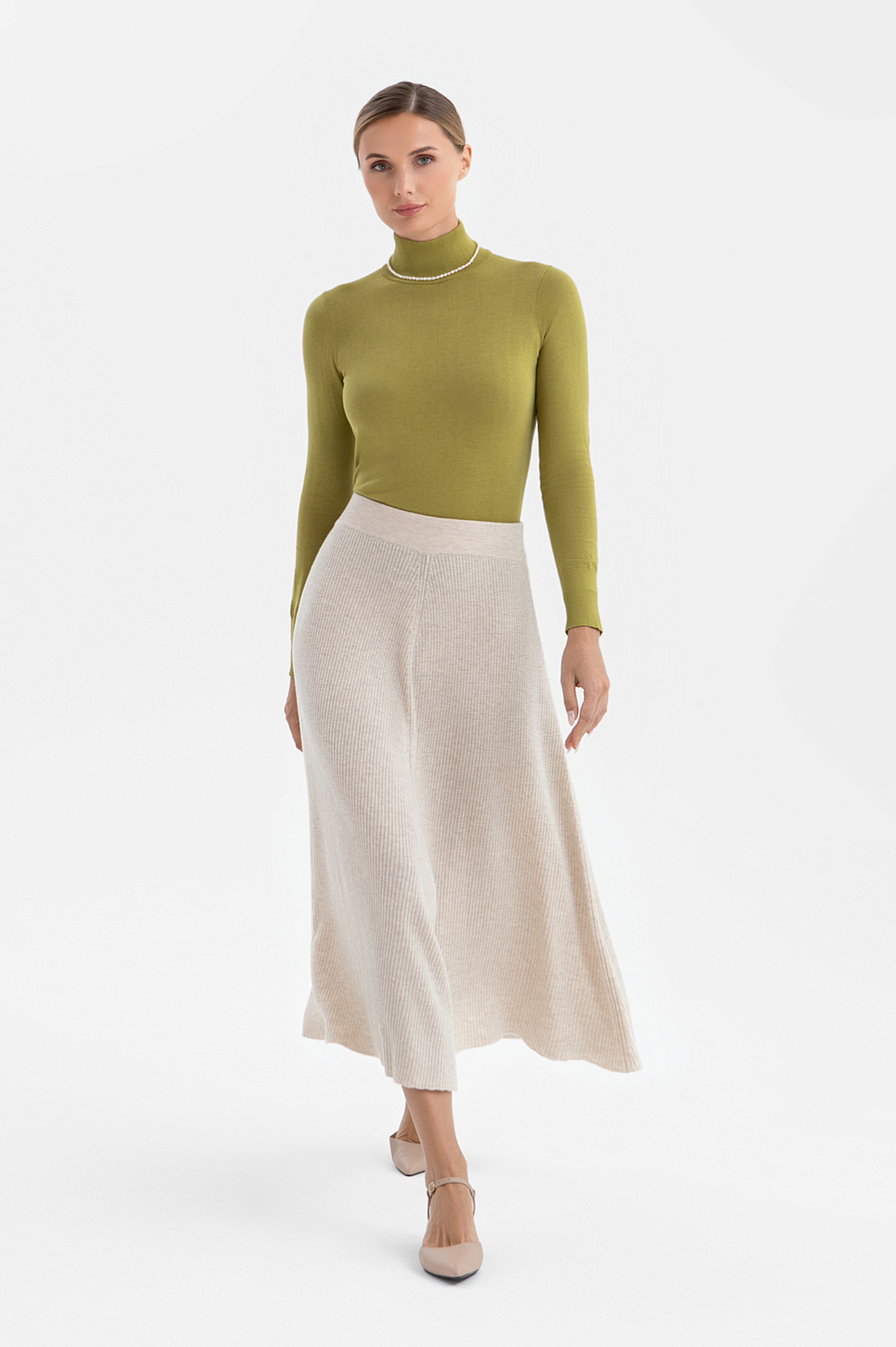 Миди-юбка KANZLER светло-бежевого оттенка из шерсти и кашемира — пример сдержанной элегантности и утончённой женственности. Универсальный крой делает модель идеальной для сочетания с классическими блузами, лёгкими рубашками или уютными оверсайз свитерами, а комфортная длина подходит для любых ситуаций — от деловых встреч до вечерних выходов. Юбка выполнена в романтичном А-образном силуэте: мягко облегая бёдра, она плавно расширяется книзу, создавая ощущение лёгкого движения и свободы. Широкий пояс подчёркивает талию и формирует гармоничные пропорции фигуры. Плотный трикотаж в рубчик из высококачественной шерсти с нежным кашемиром не только держит форму, но и остаётся мягким на ощупь, обеспечивая комфорт и приятные тактильные ощущения при носке.