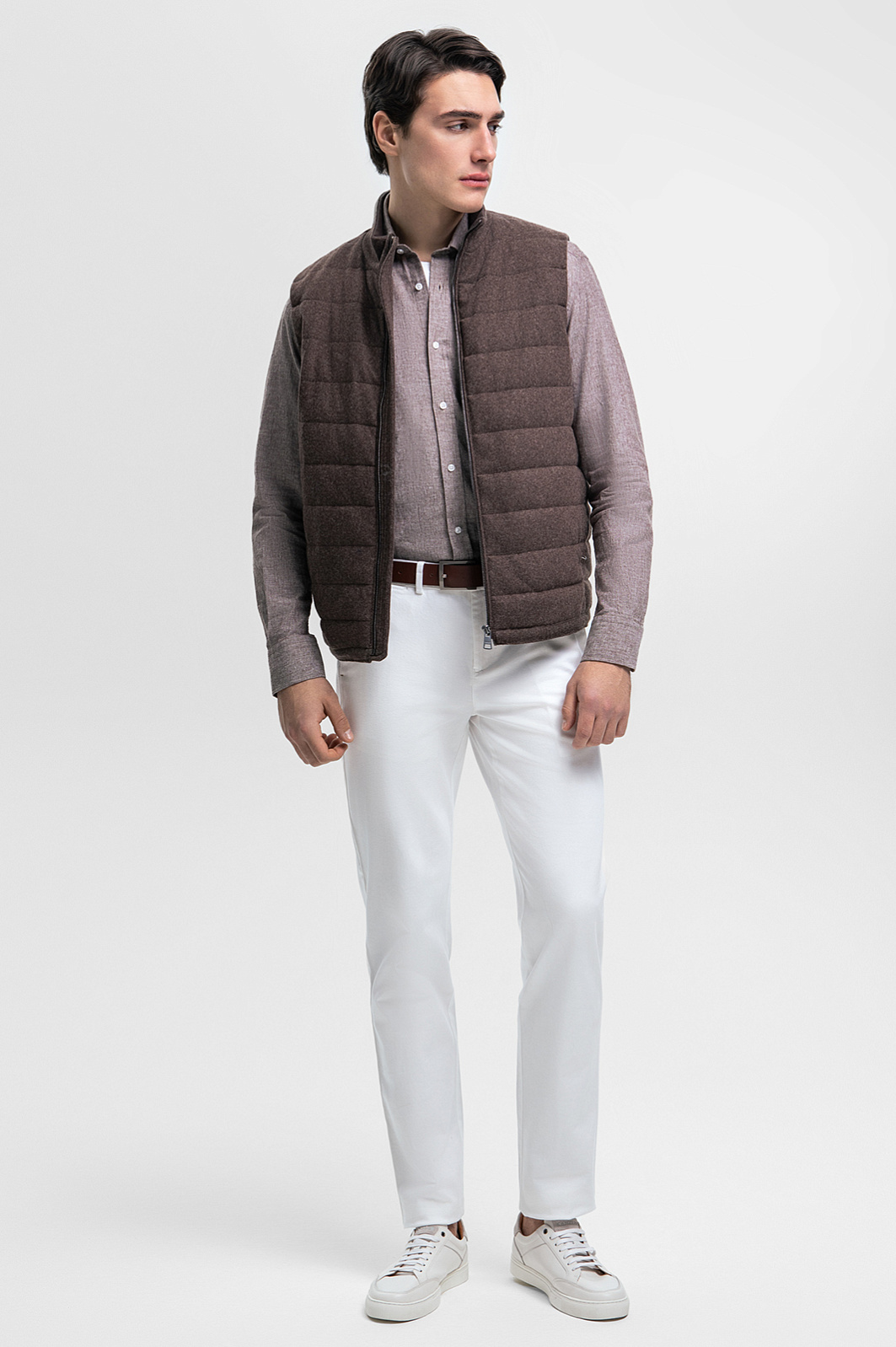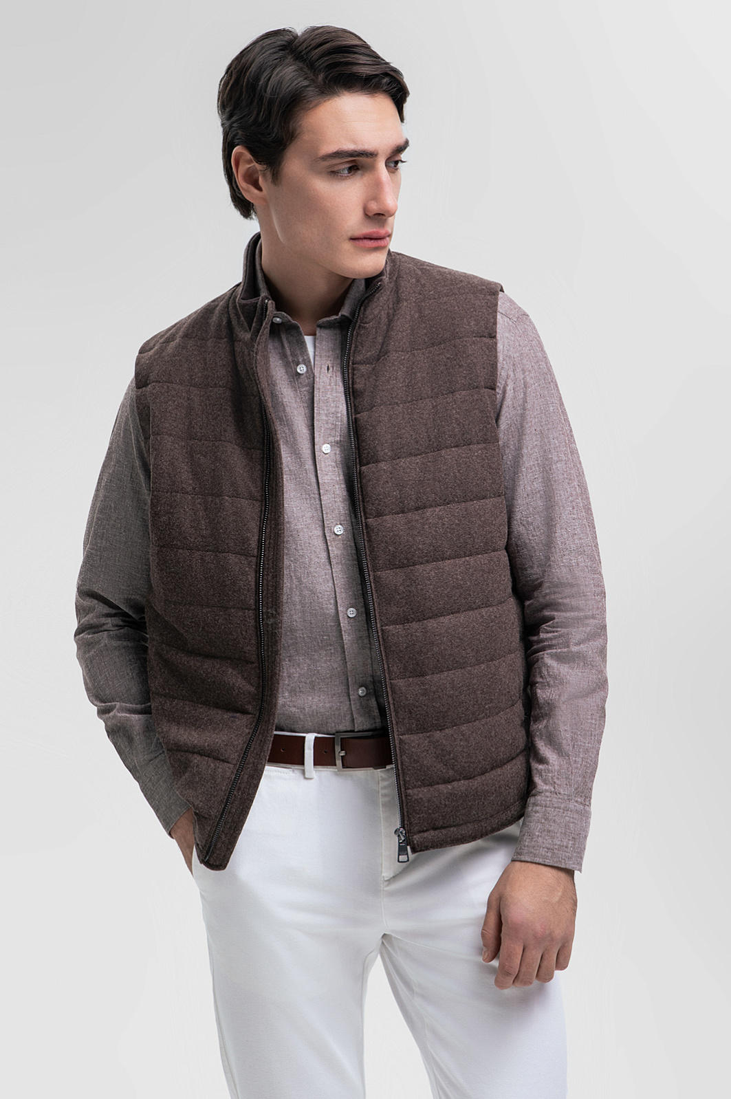 Стеганый жилет KANZLER в изысканном коричневом оттенке станет вашим союзником в межсезонье. Это идеальная основа для многослойных образов, которую можно носить в качестве верхнего слоя поверх джемпера или рубашки или в качестве дополнительного согревающего элемента под пальто. Прочный и мягкий материал на основе шерсти отлично удерживает тепло и сохраняет форму, а подкладка из гладкой ткани гарантирует комфортное прилегание к телу. Воротник-стойка защищает от ветра и холода, а функциональные карманы позволяют хранить необходимые мелочи или согреть руки в прохладную погоду. Материал премиального качества, тщательно продуманный крой и оптимальная длина – идеальное решение для тех, выбирает эстетику и функциональность, а также часто перемещается на автомобиле. Наши стилисты предлагают дополнить образ фланелевой рубашкой, светлыми брюками и белыми кедами из натуральной кожи. Параметры модели: рост 190, 103-83-99 Размер на модели: 50